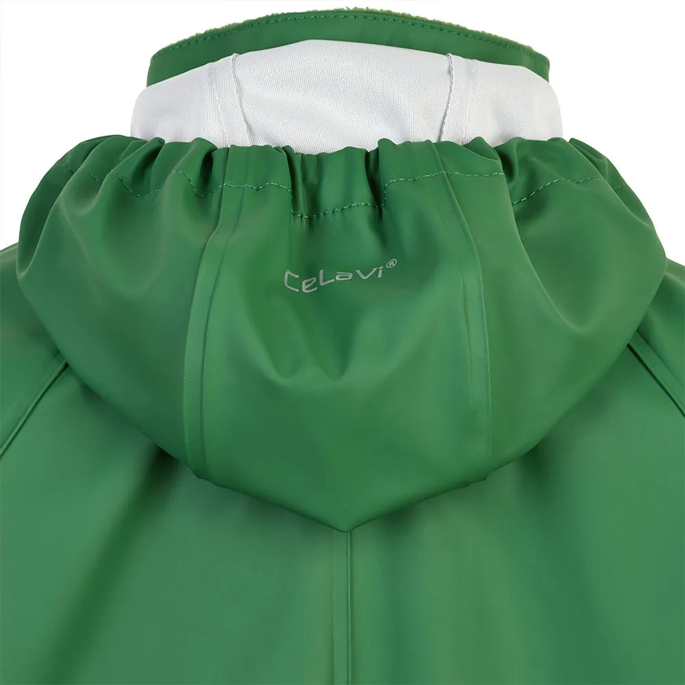 Praktisk regntøjsdragt i ensfarvet og slidstærkt PU-materiale.