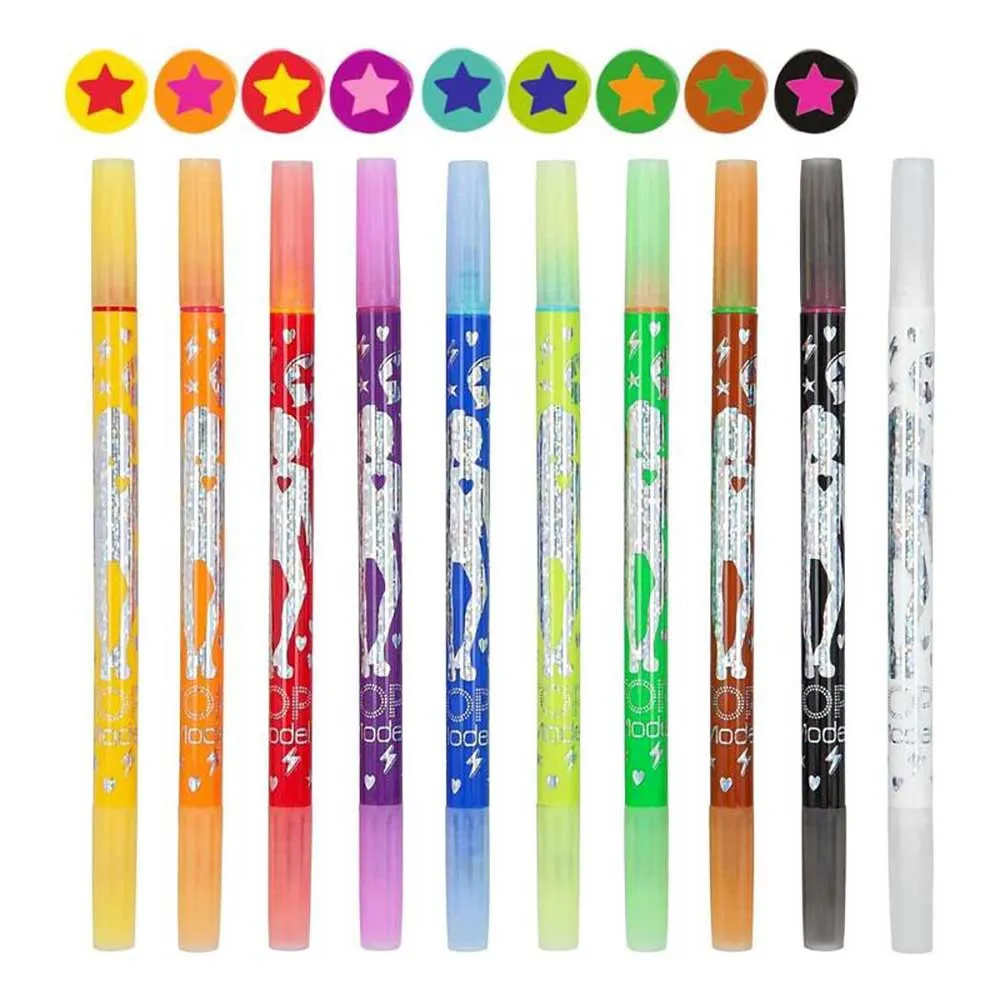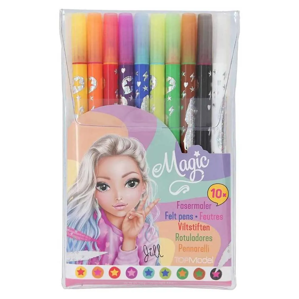 Farverig, mere farverig, magi! Disse kuglepenne gør maleri til magi: Farverne ændrer sig, når du går over dem med den magiske kuglepen. Dobbeltfibermalerne har en blød børstespids (0,5-2 mm) på den ene side og en fast, tynd spids (0,5 mm) på den anden. 9 farverige kuglepenne og 1 magisk pen pakket i gennemsigtig pose.