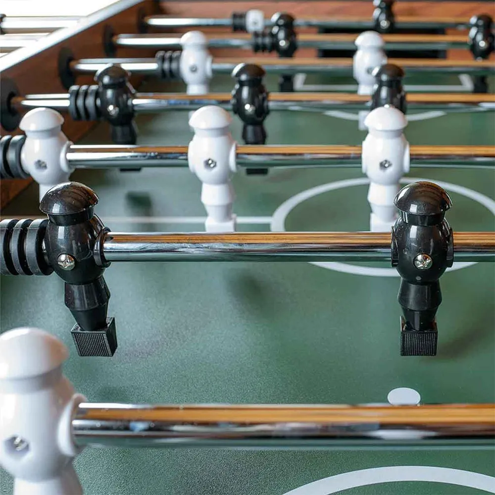 Spiloplevelsen er problemfri og kontinuerlig. Spillefladen er designet med hævede hjørner, der smart forhindrer bolden i at sidde fast og sikrer, at den altid er i bevægelse for non-stop action. Efter at have scoret et spektakulært mål, bringer det praktiske sideboldretursystem hurtigt bolden tilbage inden for rækkevidde, så du kan nulstille og dykke direkte tilbage i spillet. Hold styr på hvert hårdt tjent point med de klassiske manuelle skyde-scorere placeret i hver ende af bordet, hvilket tilføjer et autentisk touch til dine mesterskabsturneringer. For et perfekt afbalanceret spil er bordet udstyret med justerbare benjusteringer, der garanterer en helt flad spillebane, selv på ujævne gulve.