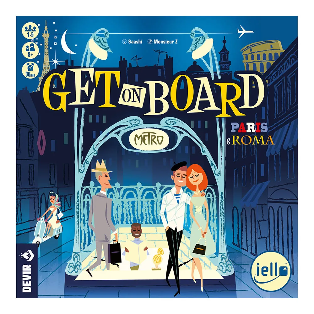 I byen, når det bliver mørkt og gadelamperne begynder at lyse, fantaserer rejsende om deres planer for natten. Farvel til arbejde. Vi tager metroen. Under jorden rasler bilerne og årstiderne flyder sammen. Natten kommer skal vi til en koncert eller spise noget. Mens vi rejser gennem transfer, drømmer sindene sig væk, suger den romantiske atmosfære i kærlighedsbyerne til sig. Hvem ved, hvor denne rejse vil føre os Designet af Saashi og illustreret af Monsieur Z, er Get On Board Paris & Roma et spil, hvor 1 til 5 spillere, fra 8 år, kan deltage i spil på ca. 30 minutter. varighed. Helt uafhængig af sin forgænger, hvis du allerede kender den originale Get on Board, hvor du skulle designe buslinjer i London og New York, vil denne version være meget bekendt for dig. Med et par enkle regler at lære, vil du straks starte spillet. Den vigtigste mekaniker i Get On Board Paris & Roma er flip og skriv, da vi i løbet af spillet vil vende en række kort (metrobilletter, i spillet) og score på vores personlige ark de møder, vi gennemfører. Afhængigt af antallet af spillere, forberedes brættet på Paris- eller Rom-siden. Hver deltager tager chips af deres farve. Og lad spillet begynde! Du har 12 runder til at bygge den bedste metrolinje i byen. Hver runde afslører du et nyt kort, der viser alle spillere linjetegningen, de skal fuldføre. Tag passagerer, hvor de vil hen, skab den mest effektive linje, og score så mange sejrspoint som muligt. For at score point skal du tegne metrolinjer, langs hvilke passagerer vil bevæge sig for at nå visse destinationer. Hjælp bedstemødre med at finde deres station, studerende med at finde filmene, flirter med at finde restauranter, og turister med at finde operaer og teatre. På den anden side vil du i løbet af spillet konkurrere om en række variable fælles mål, hvilket vil skabe spænding i spillet. I modsætning til den originale Get on Board indeholder denne udgave en tilstand, som man kan nyde alene, hvor man kan stå over for en meget krævende udfordring mod spillets AI. Get On Board Paris & Rome er en urban strategititel, der er perfekt til at spille med familie og venner. Spillene er hurtige og dynamiske, med mange forskellige pointscoringsmuligheder for spillere. Vil du fokusere på hurtigt at fuldføre fælles mål for at få en større belønning? Eller vil du hellere akkumulere passagerer, der giver dig flere bonusser?Uanset hvad, vil det altid være en god idé at være opmærksom på dine rivalers handlinger for at prøve at gætte deres strategier. Skab de bedste metrolinjer i byen og nyd fremskridtet i fuld fart.