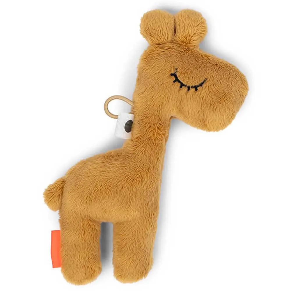 Den superbløde lille Raffi-rangle er i en blød sennepsfarve.