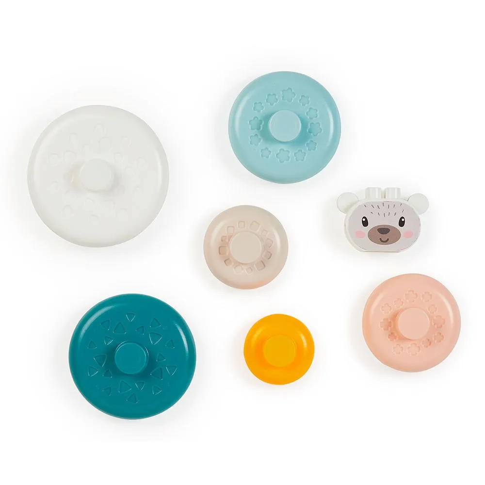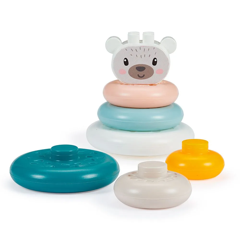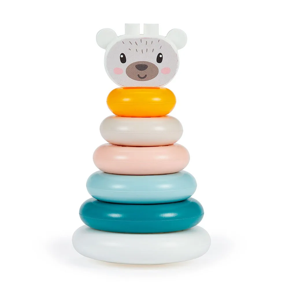 Bærepyramide til at stable og sætte sammen! Denne stabletårn skinner med bløde farver, og den barnlige design opmuntrer selv de mindste børn til at sortere de forskellige farvede ringe efter størrelse og farve.