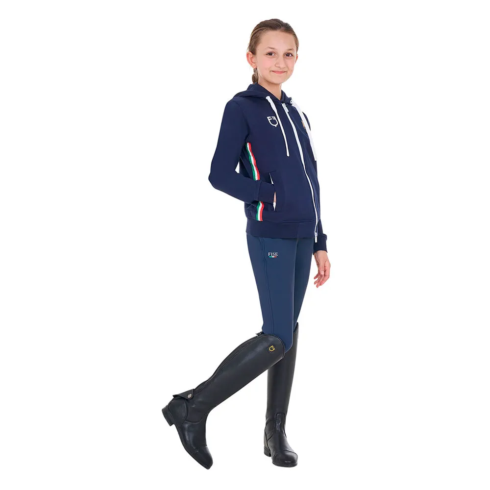 Equestro X FISE børne sweatshirt lavet af blød bomuld med en praktisk vindtæt lynlås foran og justerbar hætte, for at tilbyde rytteren uovertruffen komfort.