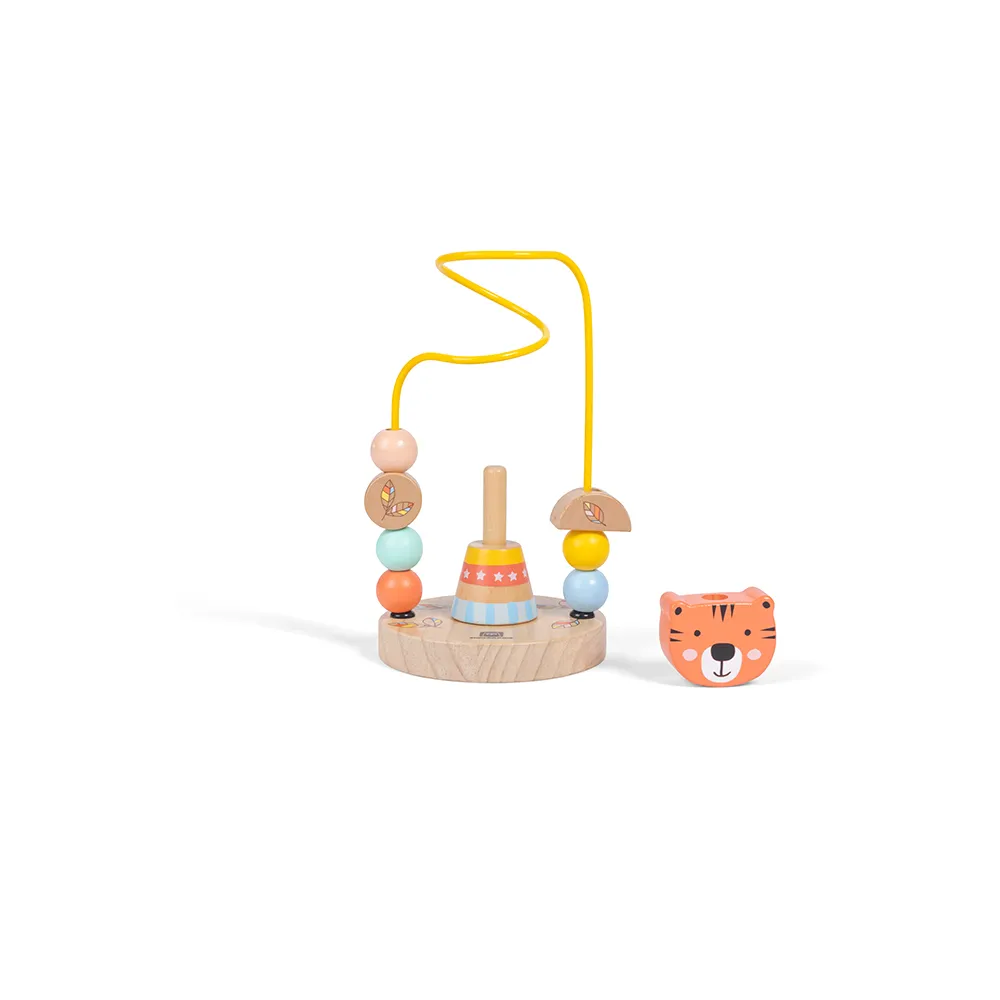 - Trælegetøj med to legemuligheder: perlelooping og stabelspil.