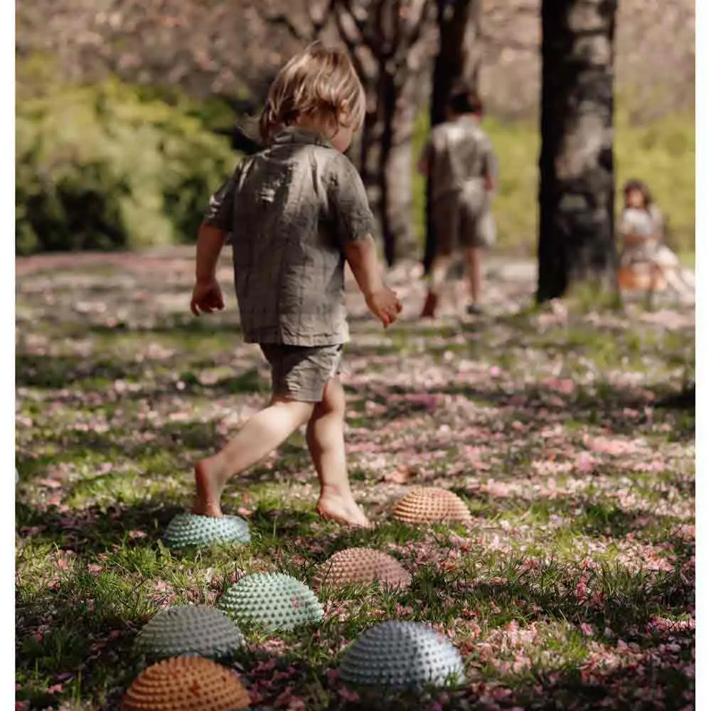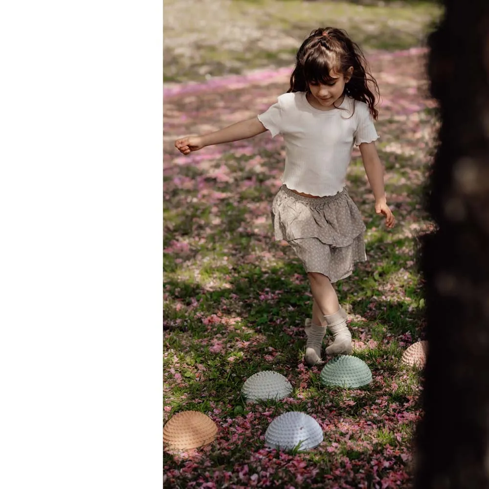 Dette sæt med fire sansemotoriske sten er designet til at træne børns balance og bevægelse på en sjov og sikker måde. Med en flad base og afrundet overflade har hver sten små takker, der ikke kun forbedrer stabiliteten, men også stimulerer følesansen og dermed den sensoriske udvikling.