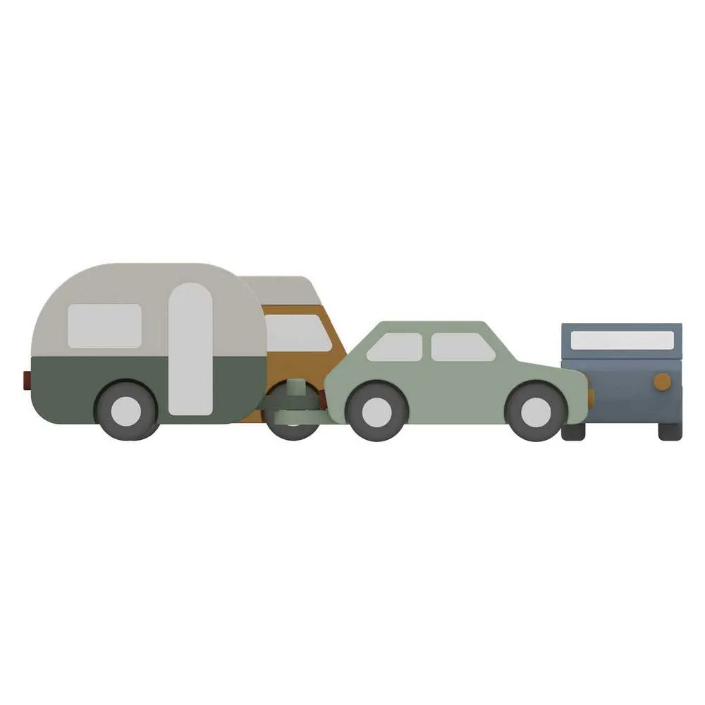 Sættet indeholder fire trækøretøjer i retrostil (en sportsvogn, en varevogn og en bil med en campingvogn, der kan bygges), så den lille chauffør kan træne sin finmotorik.