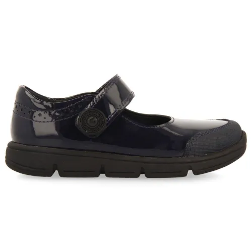 Mørkeblå laksko i lakeret skind med justerbare lukninger.