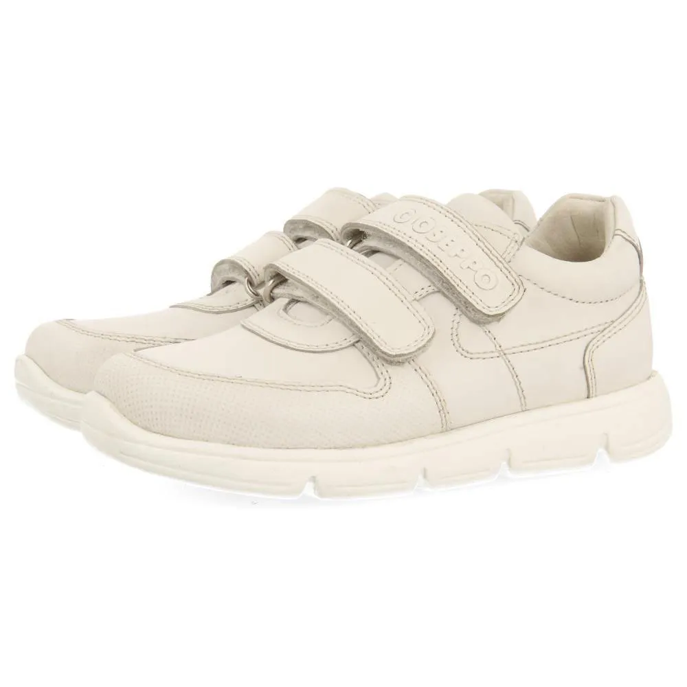 Hvide lædersneakers til skolebrug med justerbare lukninger.