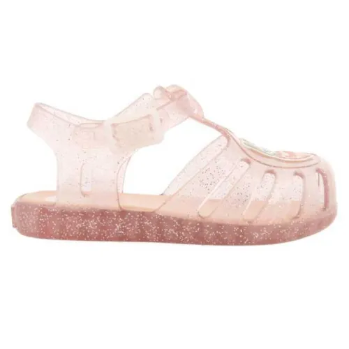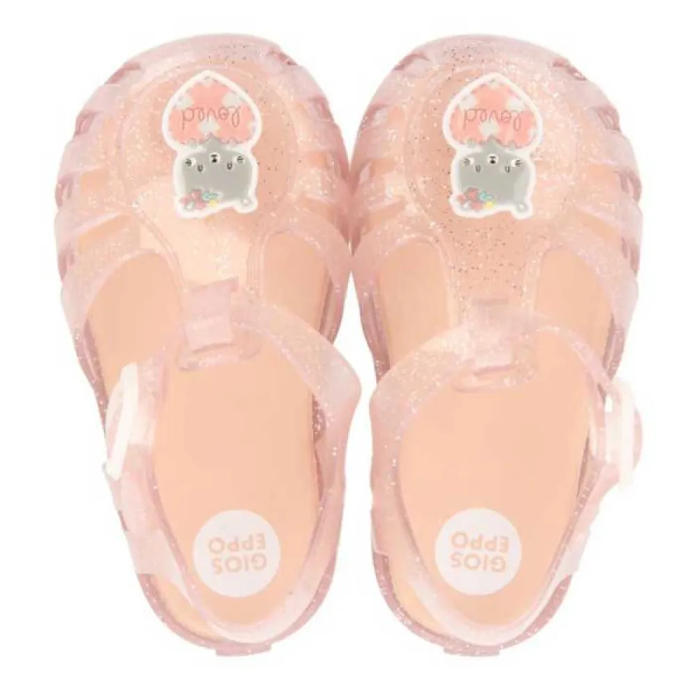 Sjovt i vandet! gennemsigtige pink glitter jelly sko med en bamse patch på overdelen.
