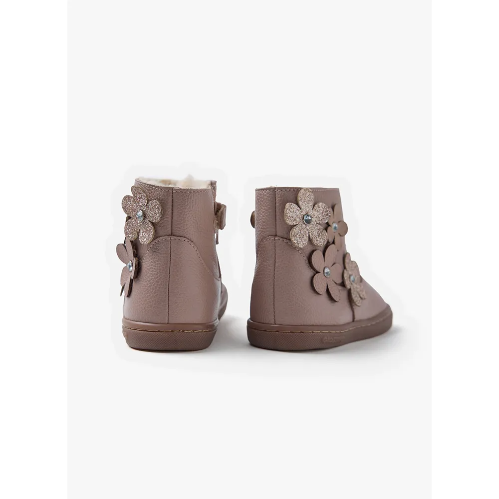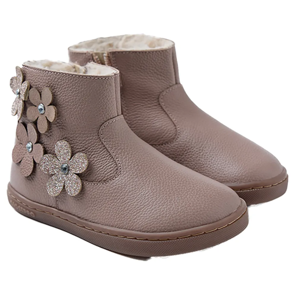 Ankelstøvler i ruskind med skinnende blomster- og rhinstensdetaljer.