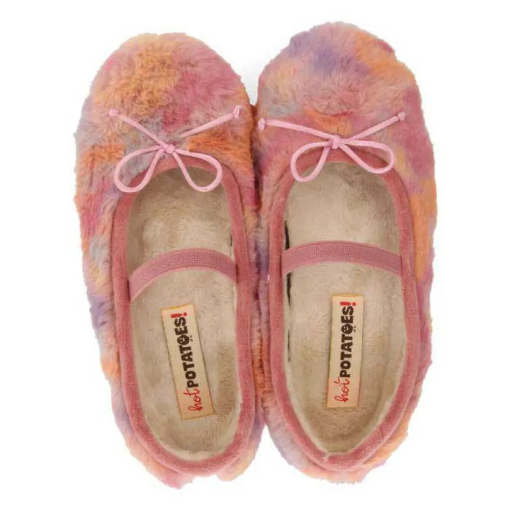 Vores kartofler elsker farver. Balletsko-stilede børnesko med elastik over foden. Lavet af genbrugt PET-filt med blød pelskant. Fjernelig indersål i 100% genbrugt polyurethanskum. Sålen er karamelfarvet naturkork med farverige EVA-gummipletter.