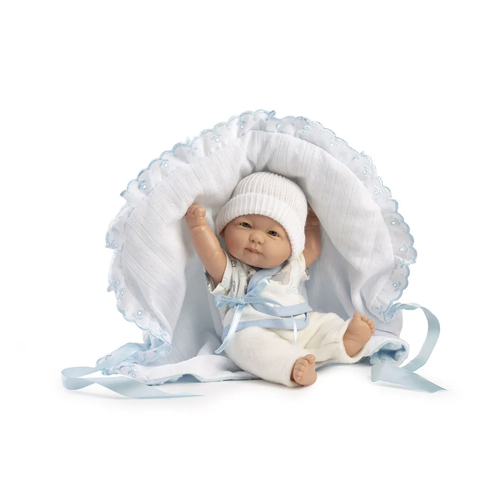 Som et supplement finder du hendes vendbare blå og hvide tæppe med en sløjfe til at binde det.