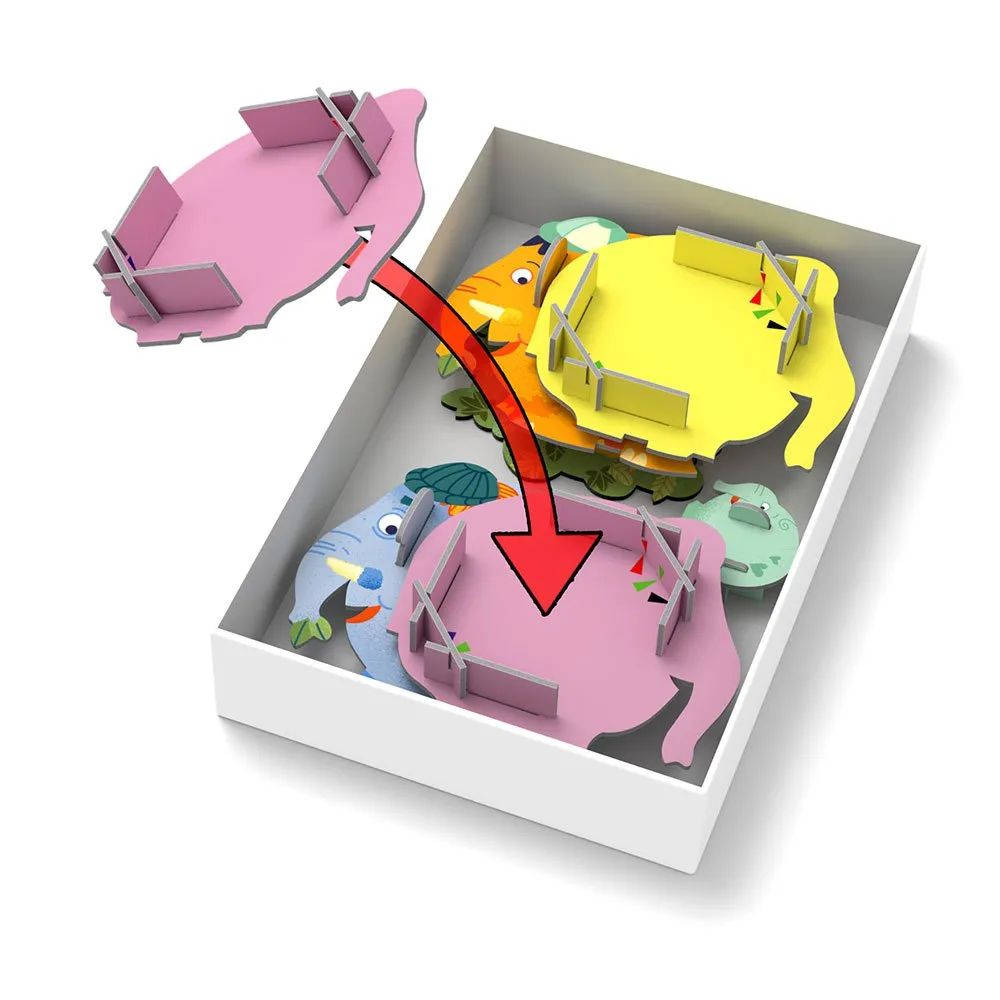 4 sultne elefanter (hver bestående af et stort elefantstykke og 2 sidestykker), 1 mini-elefant (bestående af 2 stykker), 1 busk, 32 madpoletter, 1 vejledning.