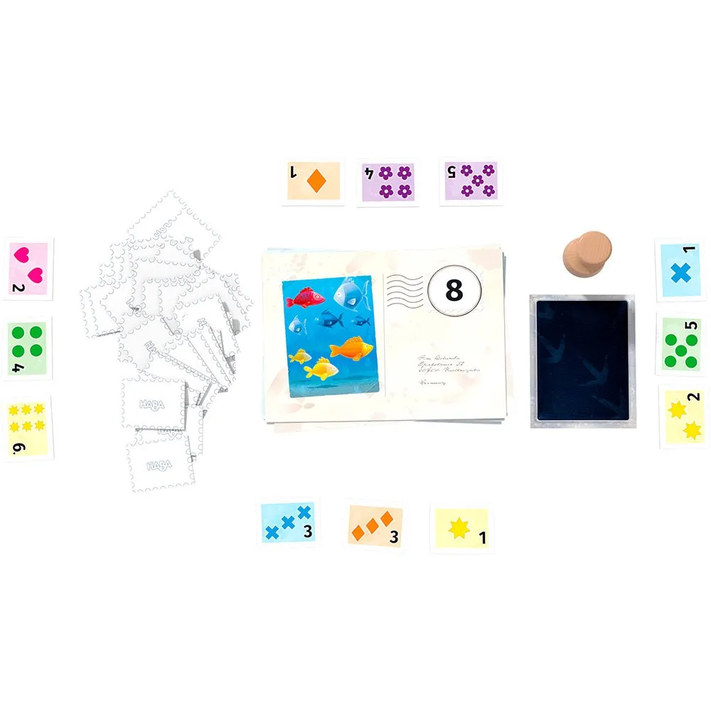 1 poststempel, 20 store kort, 53 "frimærker" brikker, 1 "blækstempel" brik, 1 spilvejledning.