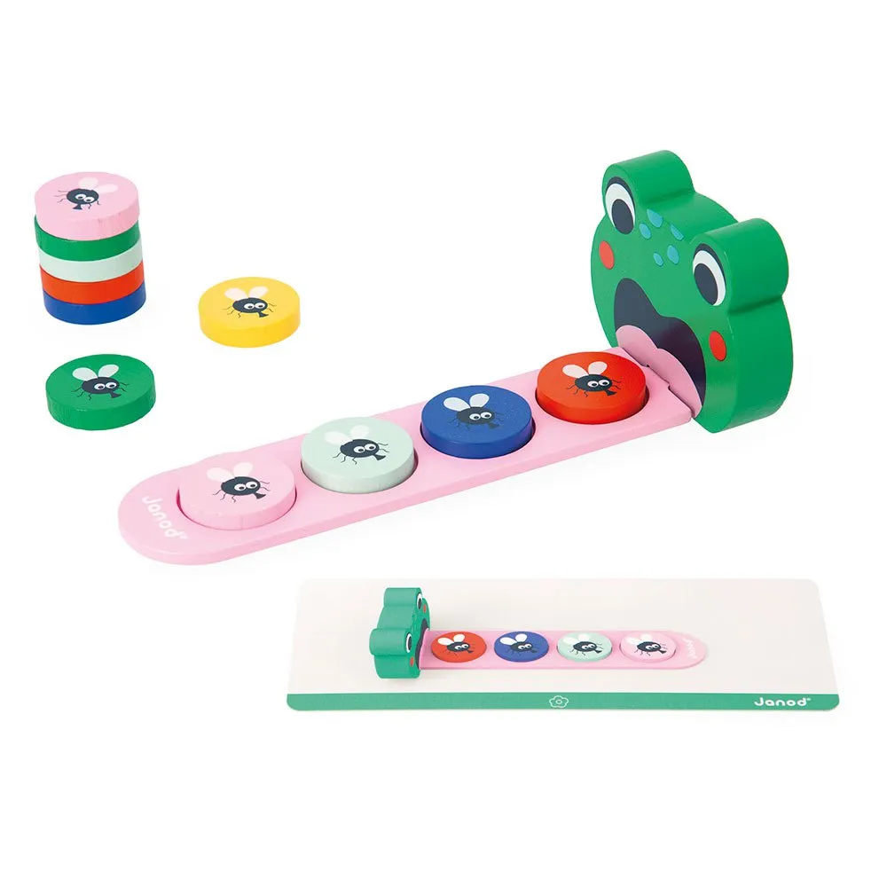Ved at placere fluer på frøens tunge vil dit barn lære at gengive og identificere en logisk sekvens af farver, mens det har det sjovt.