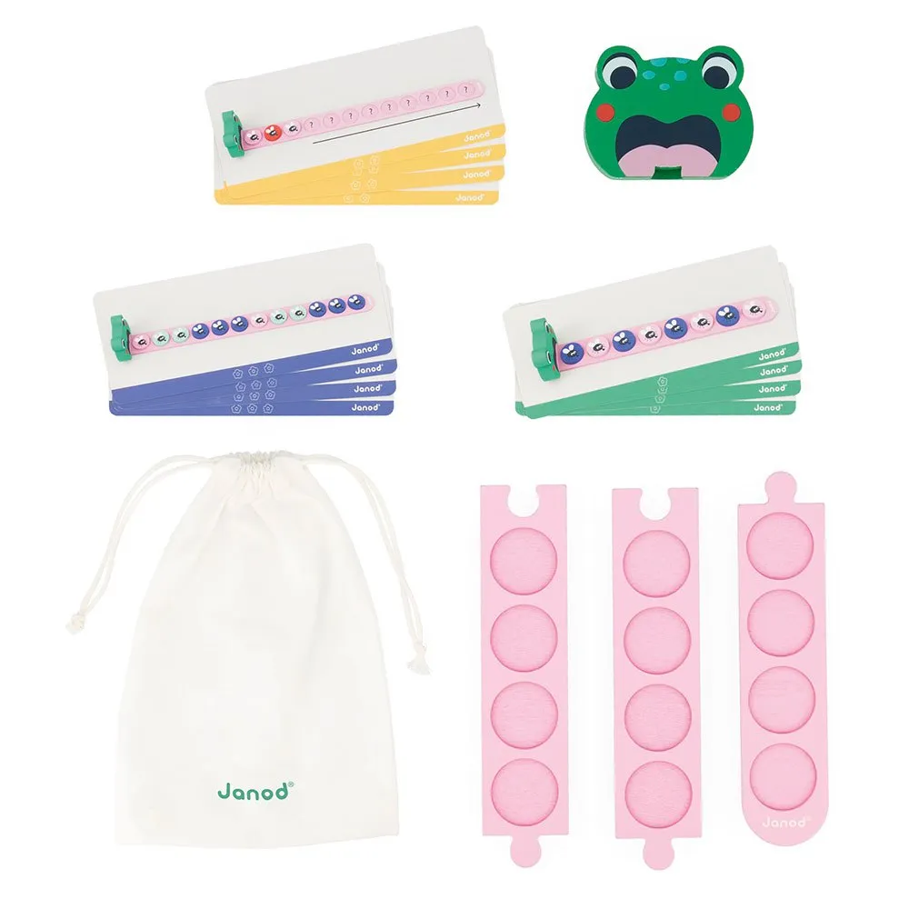 Dette spil består af en træfrø, en tunge opdelt i 3 sammenkoblede stykker, 36 fluer på farvede mønter og 12 skabelonkort.
