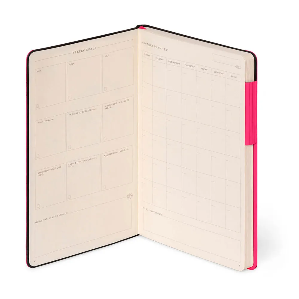Funktionalitet er vævet ind i dens elegante design. En stilfuld elastiklukning holder din notesbog sikkert lukket, beskytter dine sider mod skader og holder dine private tanker fortrolige. Mist aldrig din plads igen takket være det integrerede bogmærkebånd, som giver dig mulighed for ubesværet at vende tilbage til dit seneste indlæg. Gemt væk bagpå finder du en praktisk udvidelig lomme, det perfekte hjem for de løse kvitteringer, visitkort, billetter eller inspirerende udklip, du samler i løbet af din dag, og holder alt, hvad du har brug for, pænt samlet på ét sted.