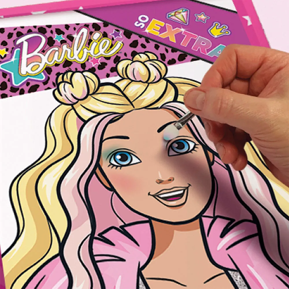 Bliv Barbies officielle stylist med dette 3-i-1 makeupsæt! Indeholder øjenskygger, blush, lipgloss, selvklæbende glimmersten, børster, en øjenblyant og en aktivitetsbog med sider med illustrationer af forskellige Barbiedukkers ansigter, udskæringer og tilbehør til at lægge makeup og personliggøre deres look.