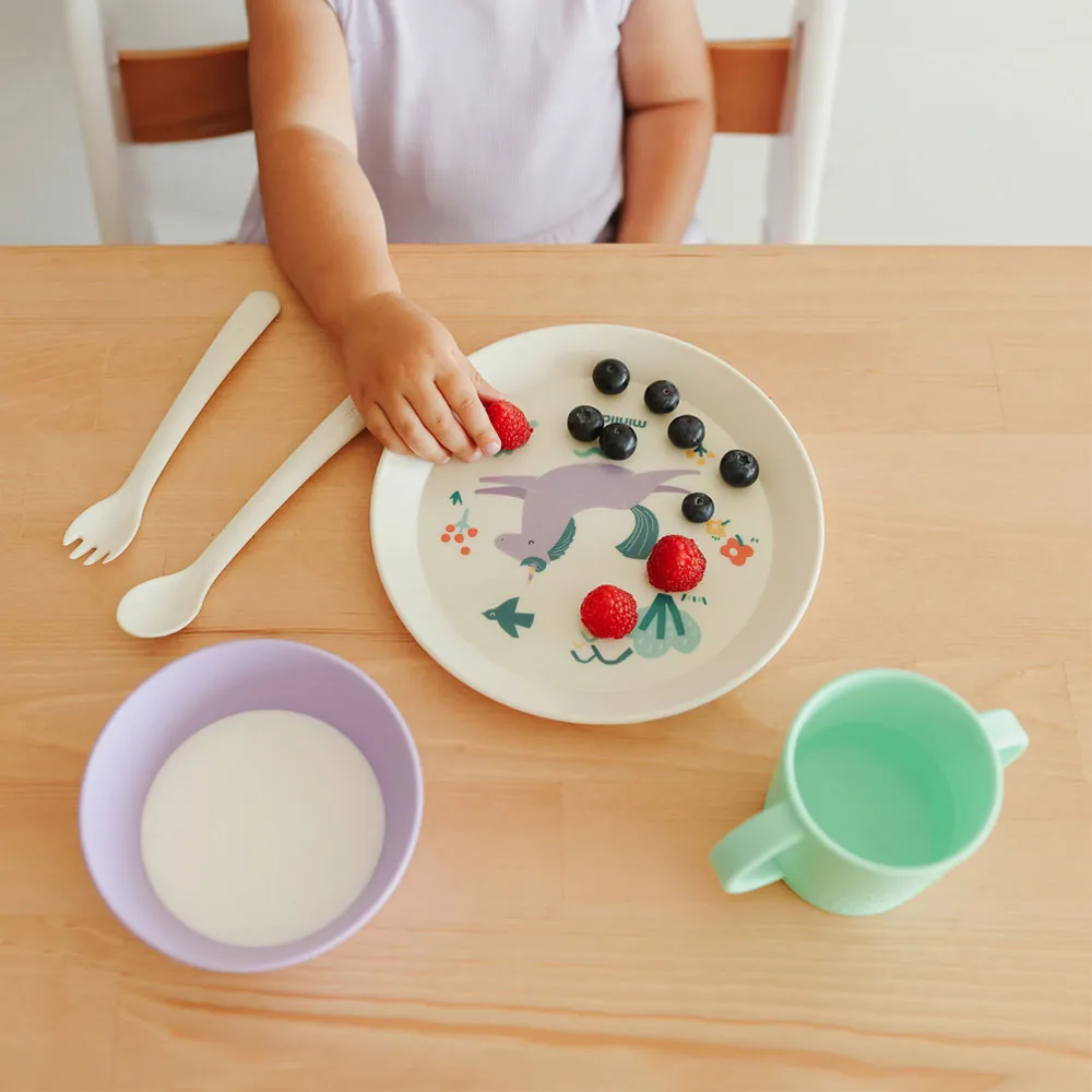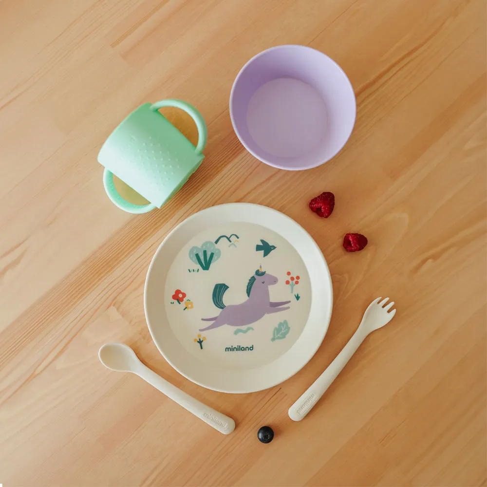 en tallerken dekoreret med en munter enhjørning, en skål med hævede kanter for at forhindre spild, en ske og gaffel med afrundede kanter og en træningskop med ergonomiske håndtag for at sikre et behageligt og sikkert greb.