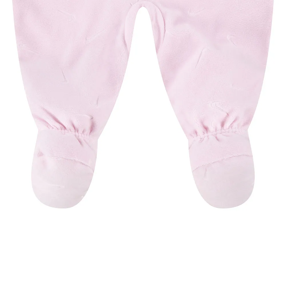 I det øjeblik du rører ved denne sovedragt, vil du bemærke dens overlegne kvalitet. Kroppen er fremstillet af et luksuriøst blødt, præget velourstof, der føles utroligt skånsomt mod en babys sarte hud. Dette bløde materiale giver en trøstende omfavnelse og tilbyder lige den rette mængde varme til en fredelig nattesøvn eller til at holde sig varm på køligere dage. Det diskrete prægede mønster tilføjer et strejf af sofistikeret tekstur, hvilket løfter dette essentielle stykke ud over en simpel pyjamas. Dette syntetiske stof af høj kvalitet er ikke kun blødt, men også holdbart og let at pleje, det tåler hyppige vaske, samtidig med at det bevarer sin bløde følelse.