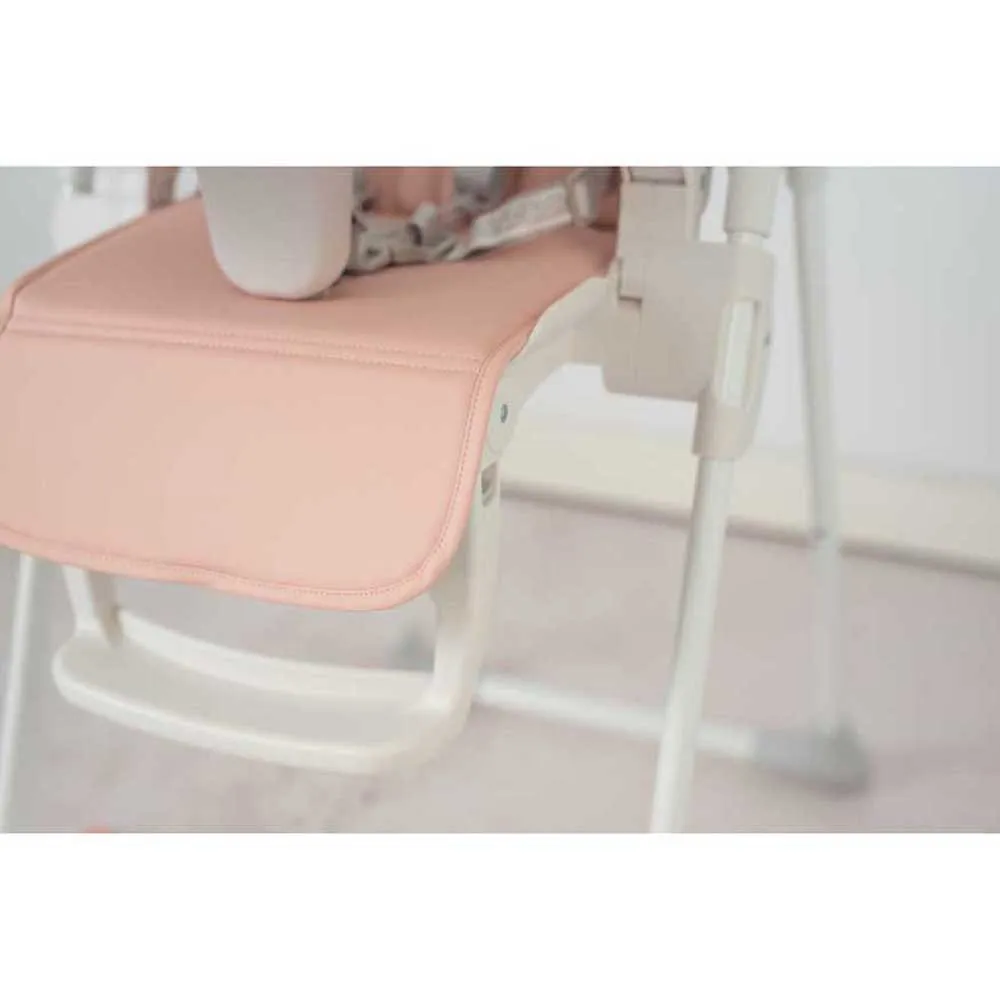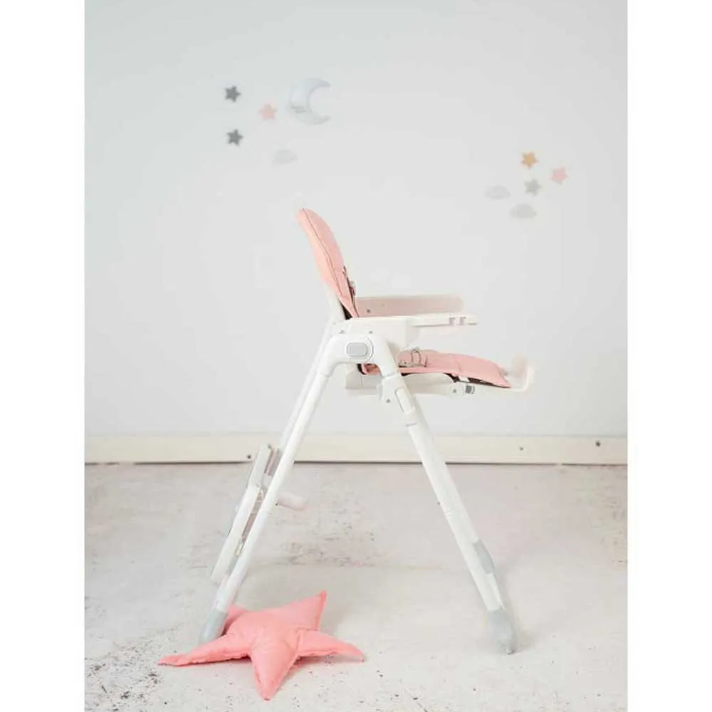 Letvægts højstol med flere positioner og et polstret sæde, der er let at rengøre. Den har hjul, nem foldning, fodstøtte og justerbart sæde i hældning og højde samt en stor aftagelig bakke. Det ideelle supplement til dine første måltider.
