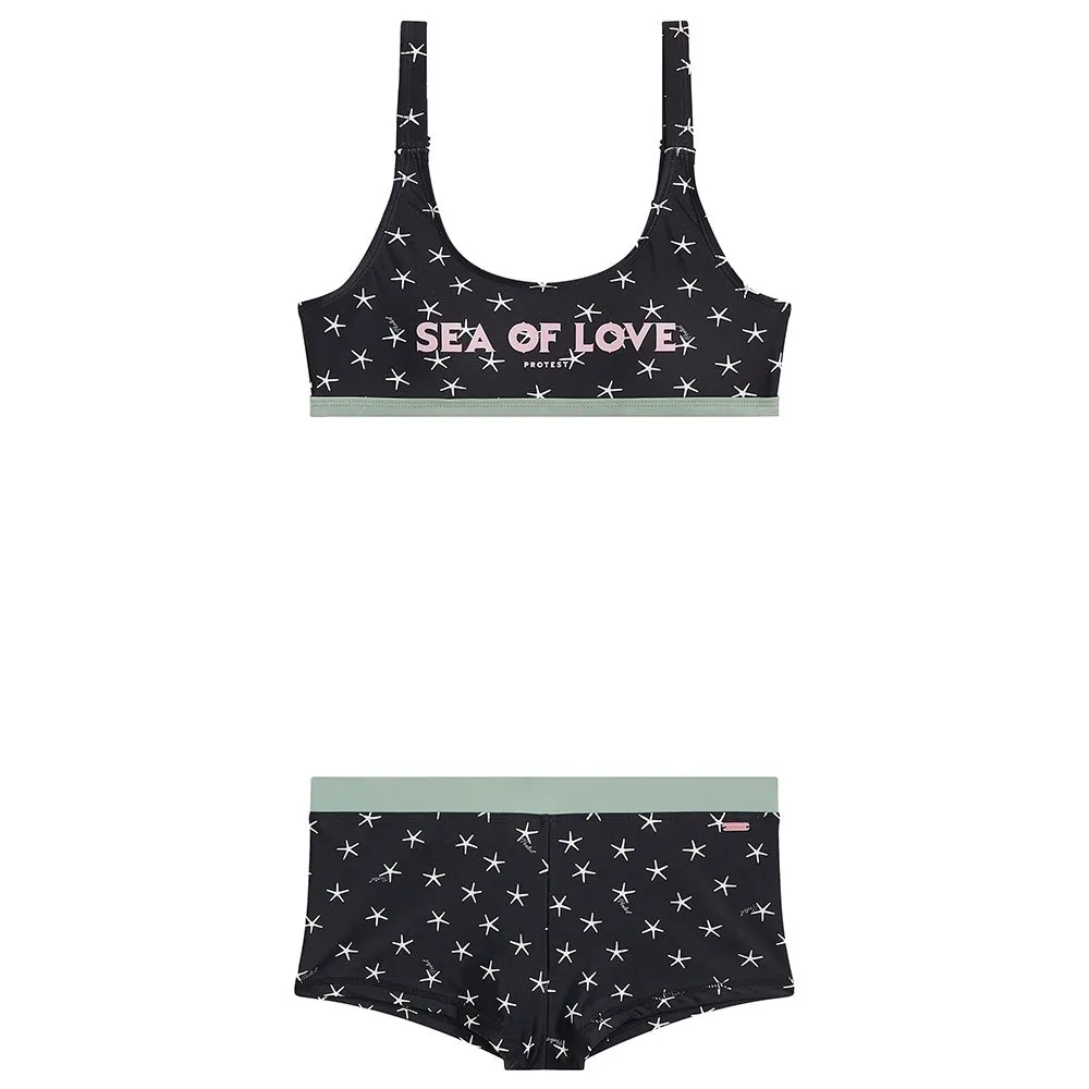Genbrugsmateriale, Bæredygtigt stof, PVRE Grøn, PFC fri, Stretch, Regular fit, Bralette top, Hipster bikini underdel, Almindelig talje, Aftagelig polstring, Hurtigtørrende, Skumkopper til størrelse 140-176.