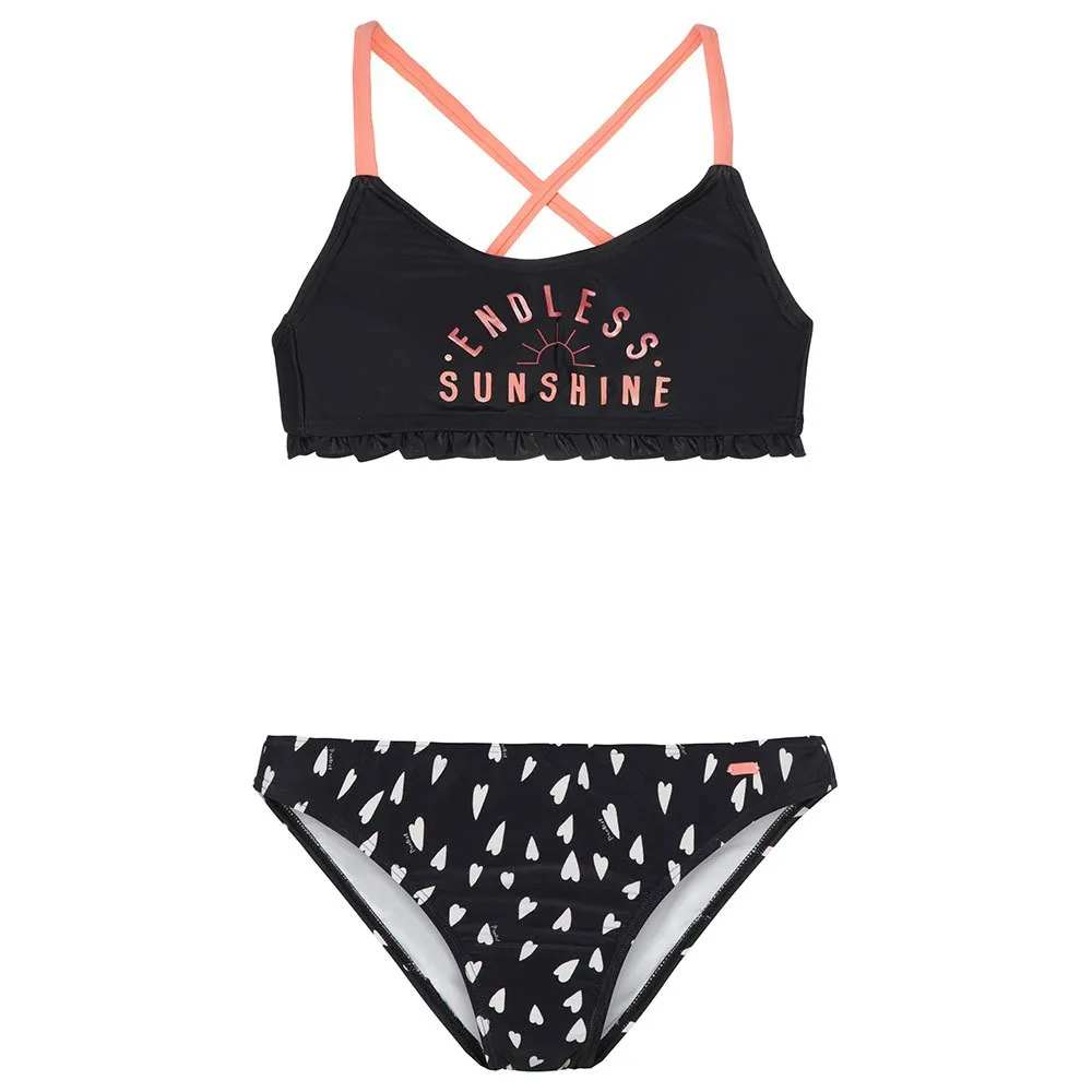 Bikinitoppen har en cool grafik printet på brystet, hvor der står 'Endless sunshine', og der løber en flæse langs den nederste kant.