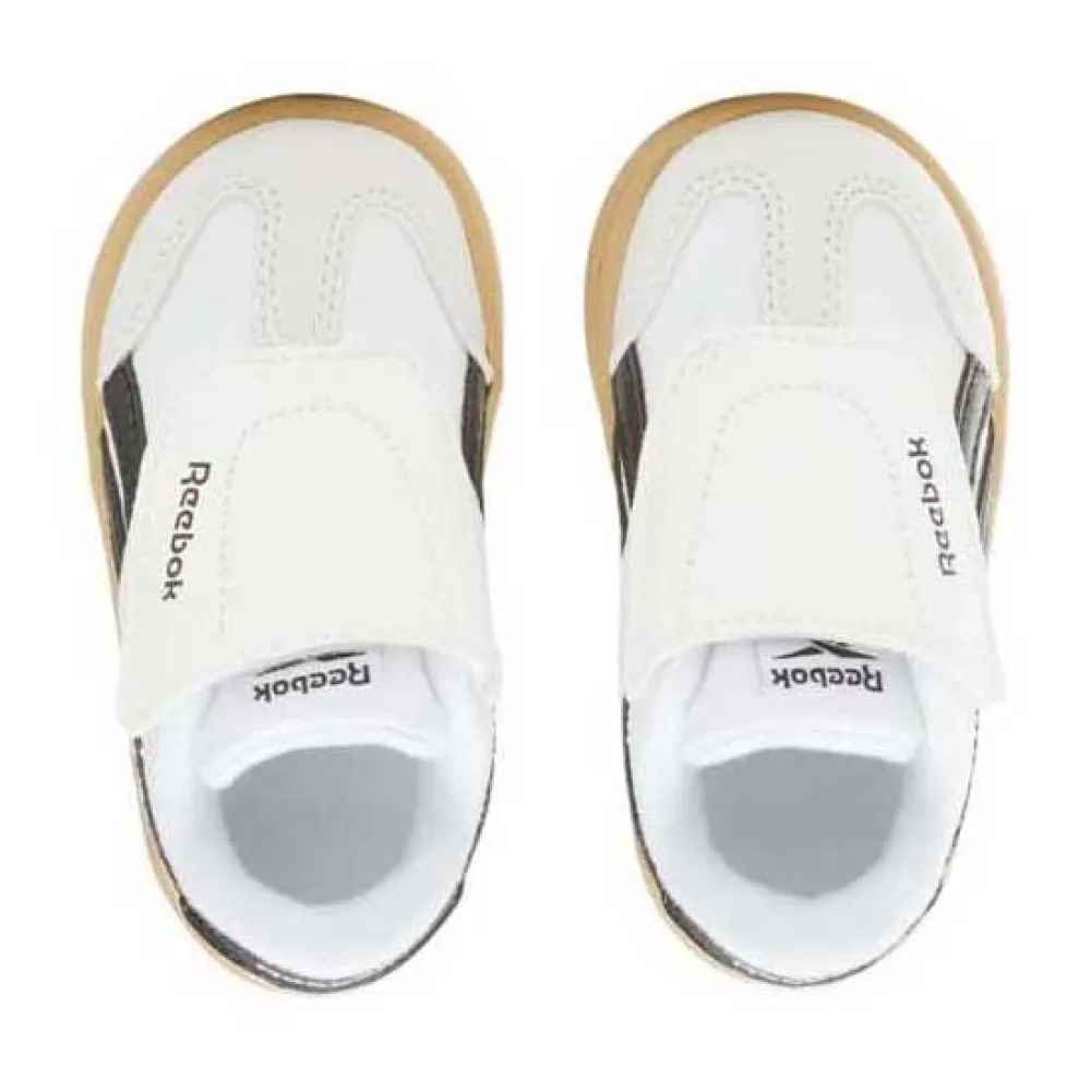 Fodboldinspirerede sko til små stilstjerner/Disse baby-Reebok sko bringer klassisk fodboldstil til deres legepladslook. Nem og hurtig af- og påtagning med en tyk klittenbåndsrem. En gummisål fuldender designet perfekt.