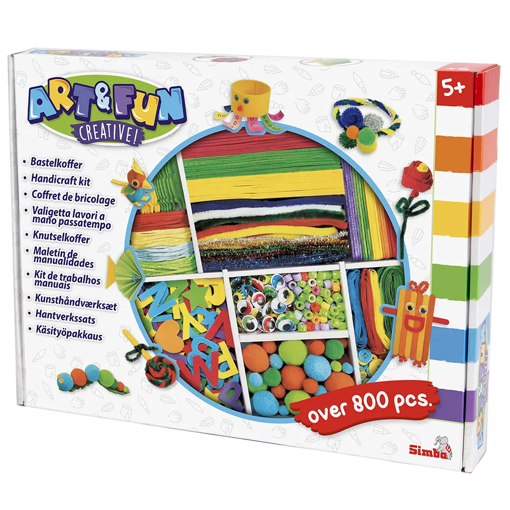 Inde i denne farverige kuffert vil din lille kunstner opdage et blændende univers af muligheder. Dette er et omfattende Art & Fun kreativitets-sæt med 826 dele (lim medfølger ikke), for alderen 5 år og opefter. Den store variation af materialer inviterer børn til at drømme, designe og konstruere alt, hvad de kan forestille sig. Lad deres fantasi løbe løbsk, når de kaster sig ud i spændende kreationer med pailletter, perler, filt og meget mere. Samlingen indeholder et rigt udvalg af farverige piberensere, bløde pomponer, vrikkende rulleøjne, forskellige hobbyark og andre fascinerende teksturer og former, der giver alle byggestenene til uendelige projekter.