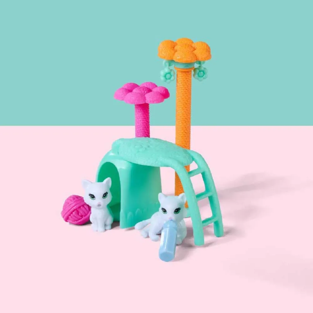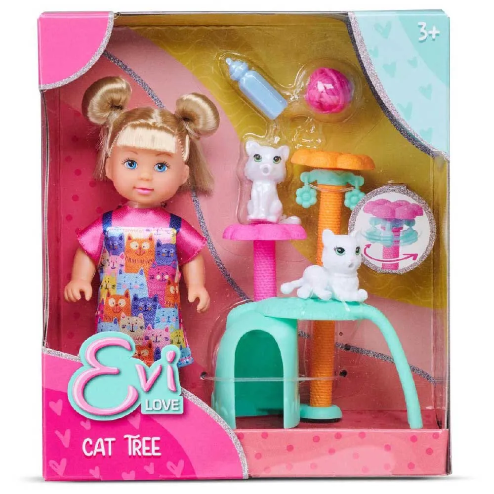 Evi iført en sød kjole med kattetryk, inklusive en kradsestolpe, to kattefigurer og masser af tilbehør til at pleje hendes pelsede venner.