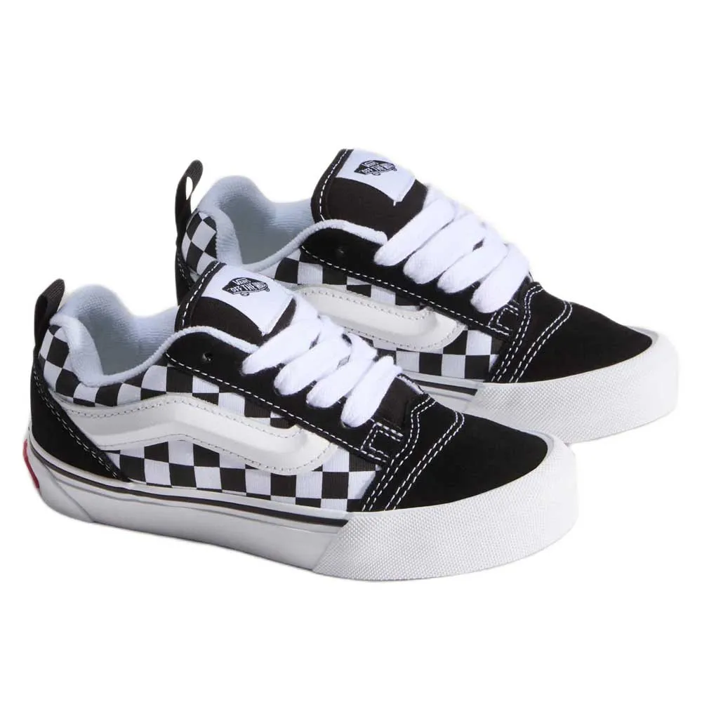 Udstyr din unge trendsætter med Vans Knu Skool Youth Trainers, en frisk, chunky fortolkning af den ikoniske Old Skool. Disse sneakers er bygget til aktive børn og har en slidstærk læderoverdel, en forstærket tåkappe og den karakteristiske Vans vaffelsål for overlegent greb. Den overdrevne, polstrede æstetik giver enestående stil, mens den polstrede pløs og krave sikrer komfort hele dagen til legepladsens eventyr. Med et lavt snit for mobilitet og sikker snøring er disse unisex-trænere den perfekte blanding af dristig mode og hverdagsfunktion til børn, der ønsker at skille sig ud