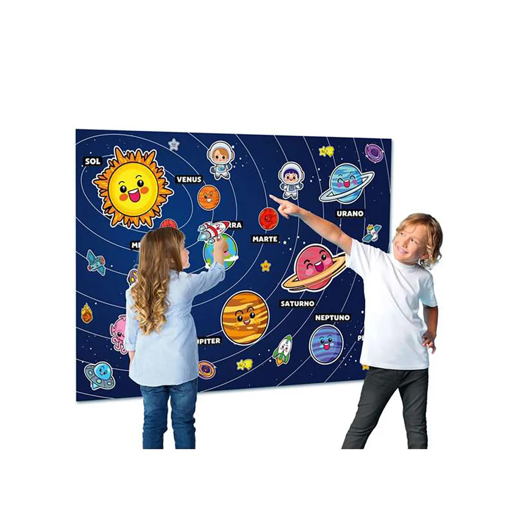 Midtpunktet i dette sæt er spillet Opdag Solsystemet. Et stort, smukt detaljeret filterpanel med velcro indeholder 42 rumfigurer, der skaber et stort lærred til kosmisk historiefortælling. Dette interaktive panel fungerer som baggrund for utallige eventyr og indeholder planeter, astronauter, raketter, satellitter, asteroider og mere. Hver af de 42 figurer er lavet, så små hænder let kan håndtere dem, og de klæber sikkert til panelet, men er samtidig nemme at flytte rundt på for endeløse arrangementer.