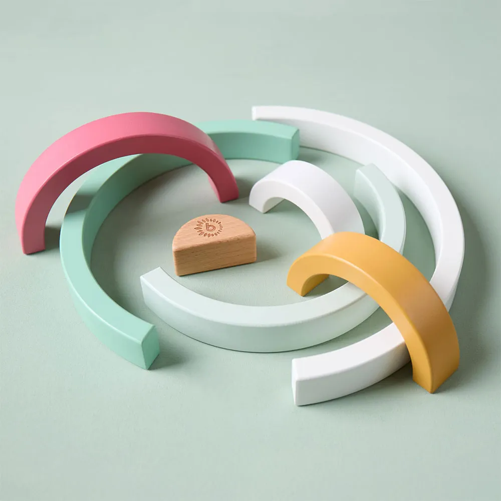 Die 7 stabilen und griffigen Holzbögen können von deinem Kind gestapelt, sortiert oder individuell bespielt werden.