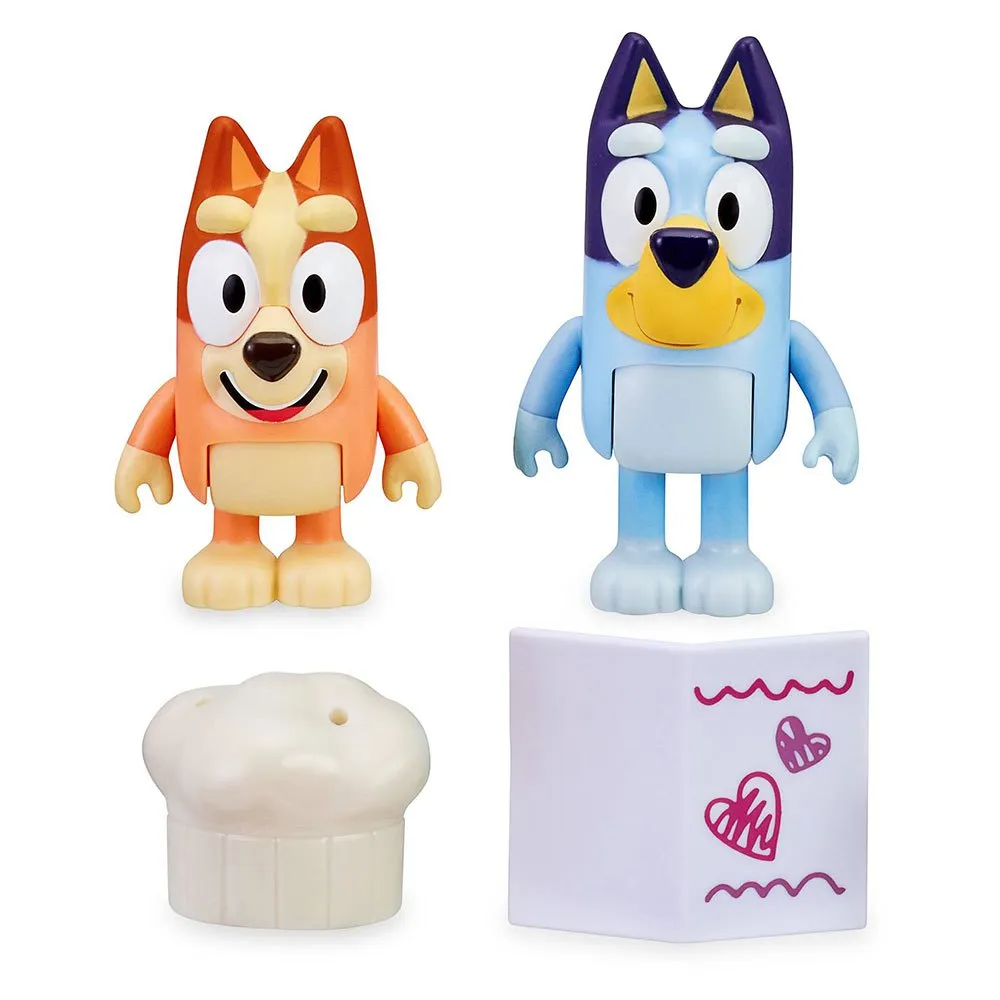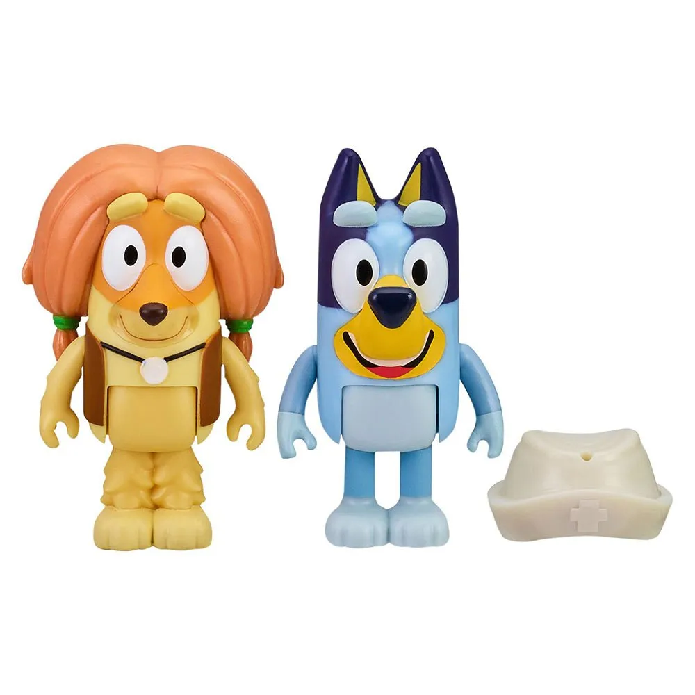 Kinder können mit dieser Packung aus zwei Figuren die Abenteuer von Bluey und seiner Familie nachspielen.