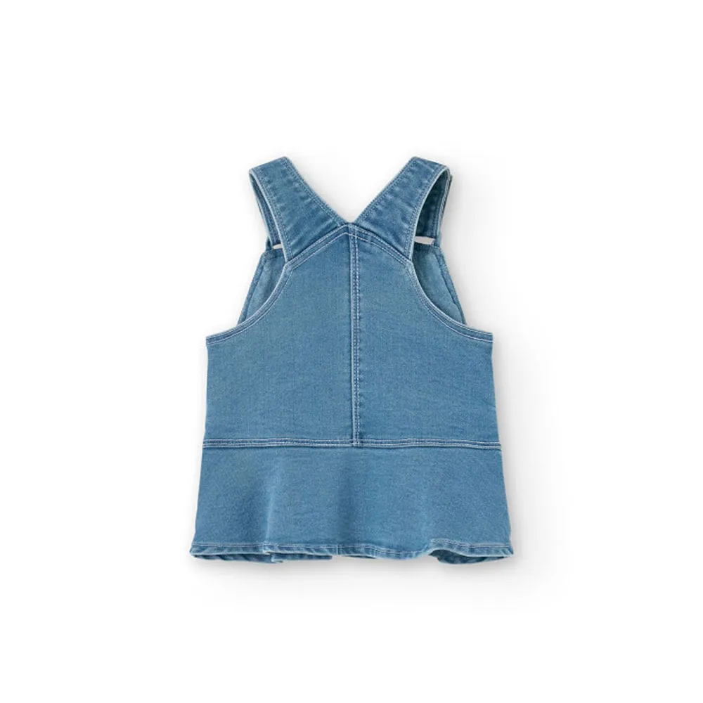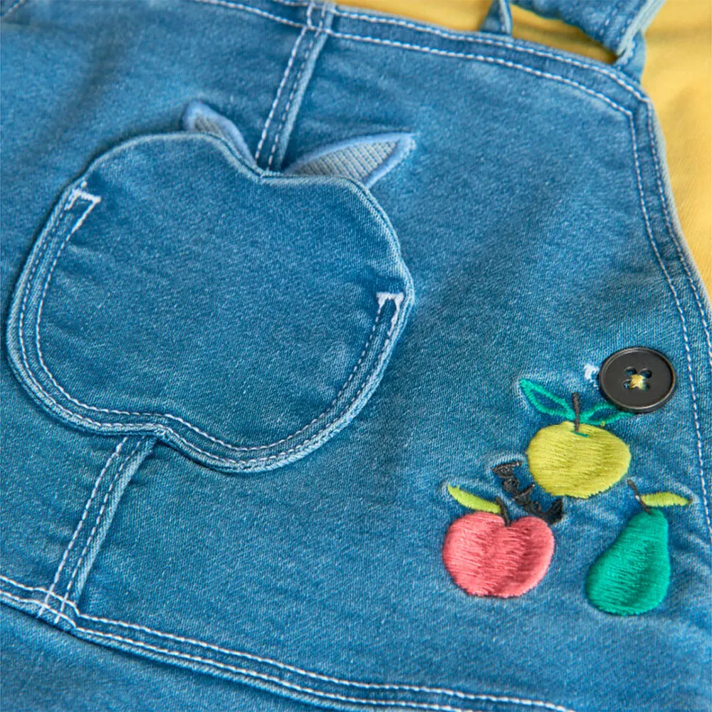 Die Latzhose besteht aus marineblauem Strickstoff, hat Träger und eine apfelförmige Stickerei sowie weitere kleine Fruchtzeichnungen.