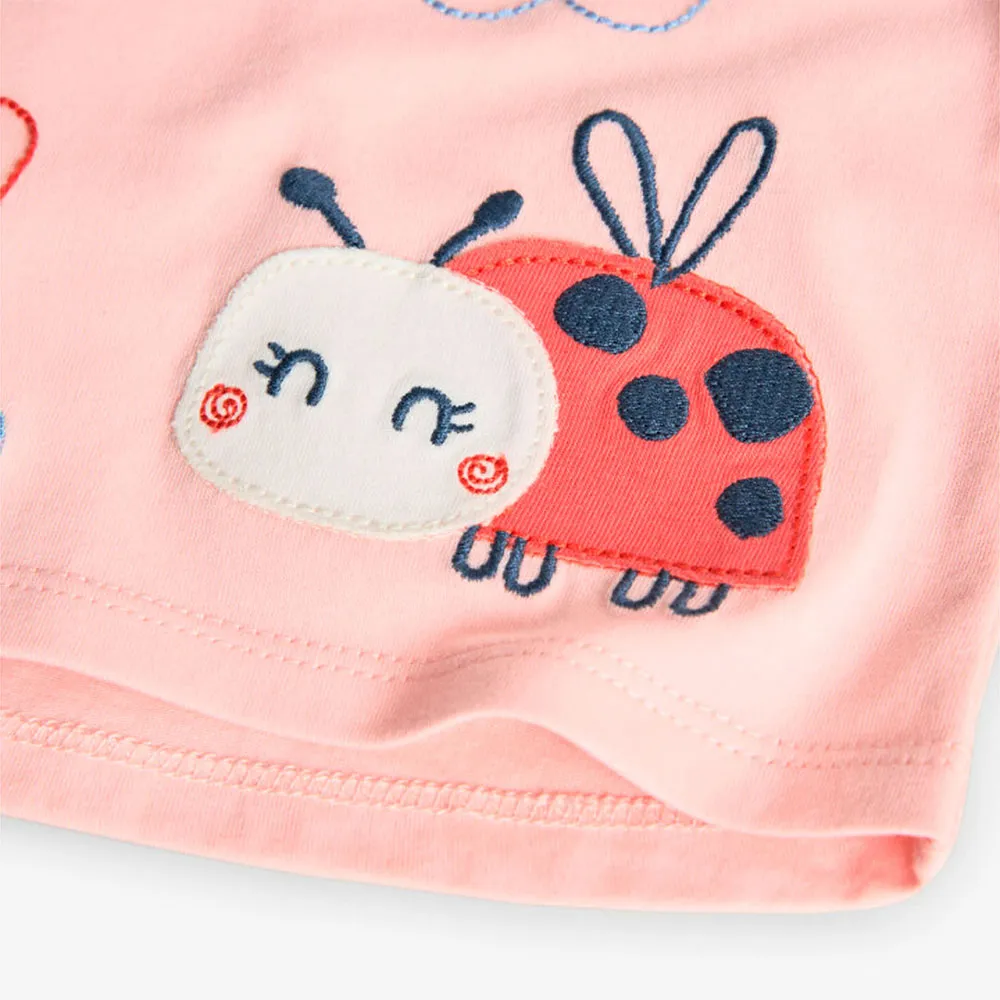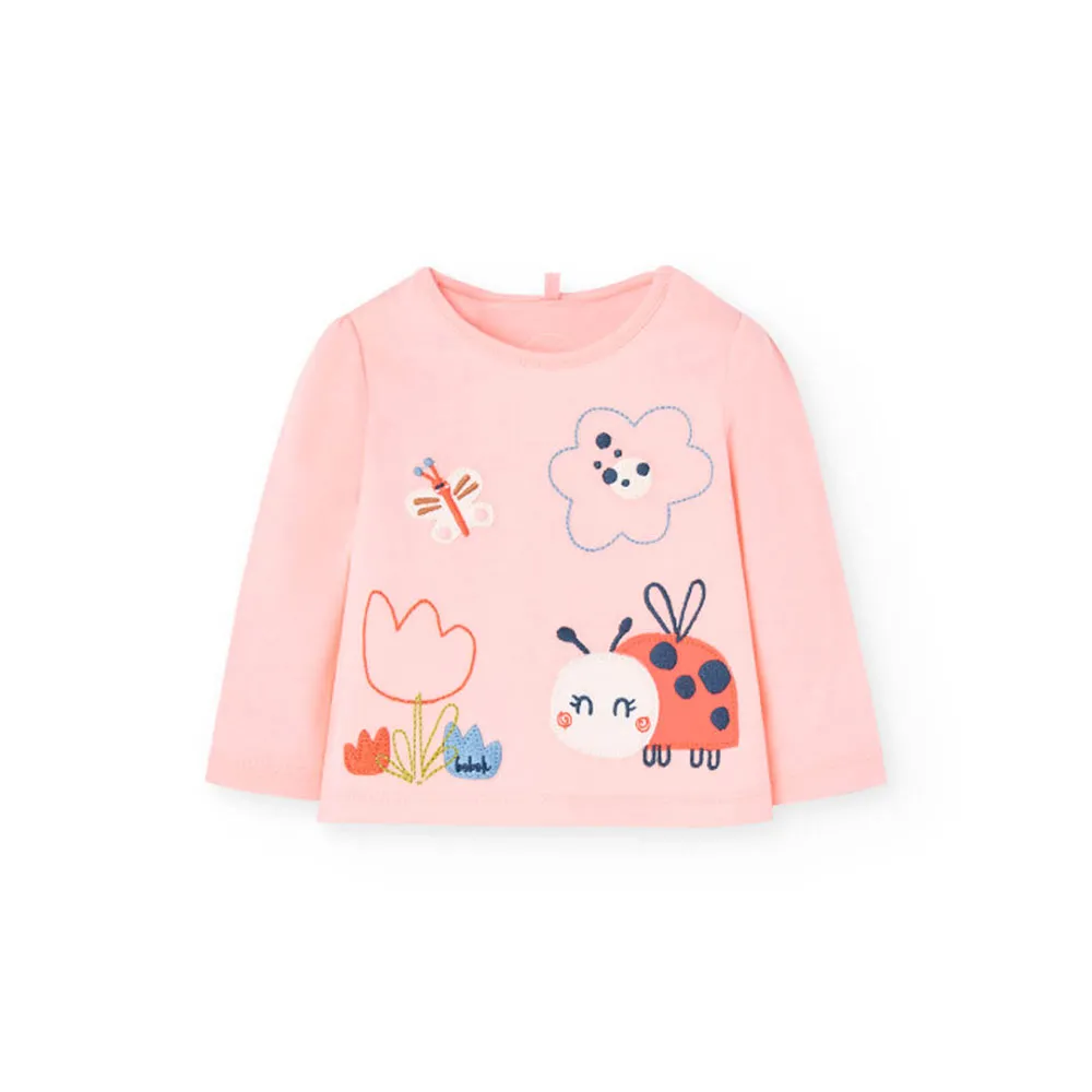Das zartrosa T-Shirt hat ein lustiges Design mit gestickten Tieren und Blumen, das einen fröhlichen und charmanten Touch verleiht.