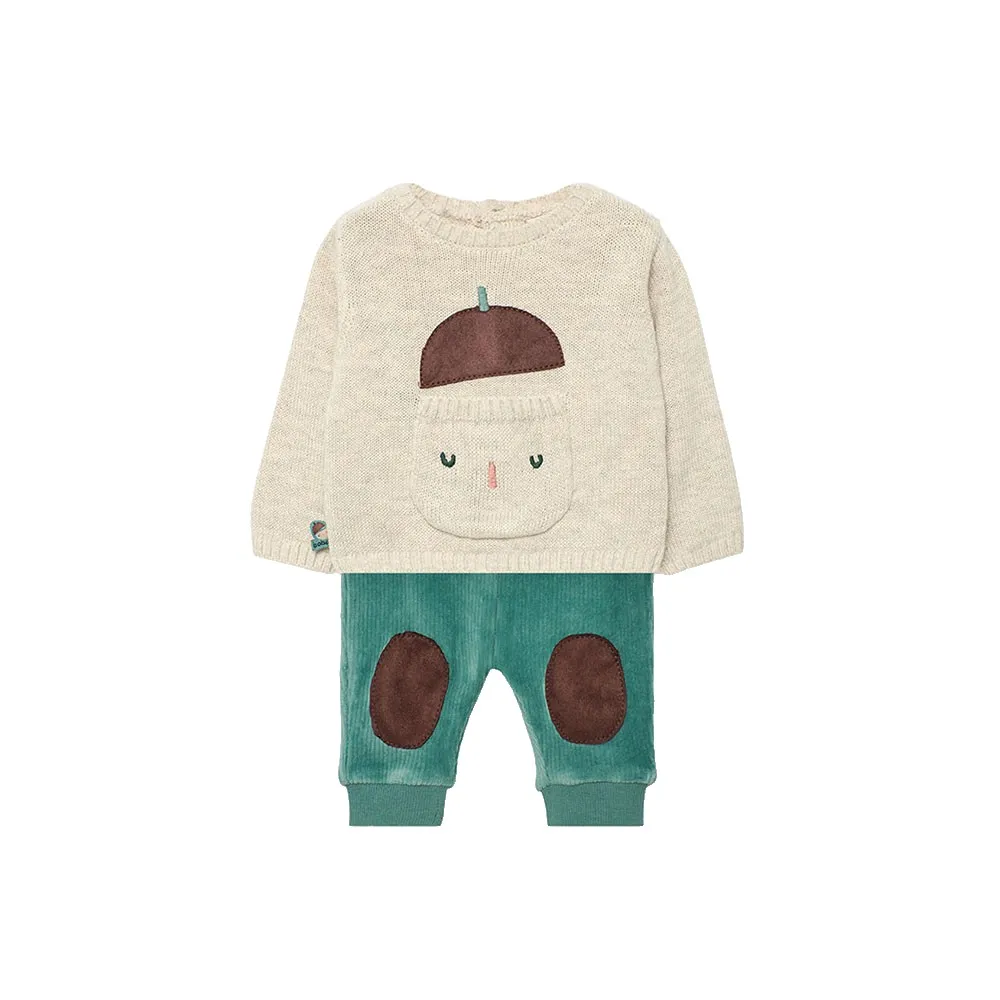 Dieses Strickset beinhaltet einen Pullover mit zarten Stickereidetails und passende Hosen, die maximalen Komfort für Ihr Kleines gewährleisten.