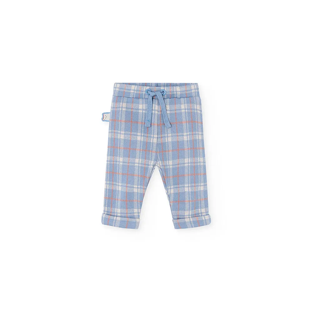 Babystrickset in Blau mit Tier- und Karomuster, ideal für die Herbst- und Wintersaison.