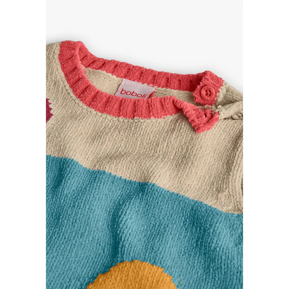 Beiger Strickpullover für Mädchen, entworfen für die Herbst- und Wintersaison, mit kontrastierenden Kreisen in Blau, Rot und Senf, die der Kindergarderobe eine spielerische und moderne Note verleihen.