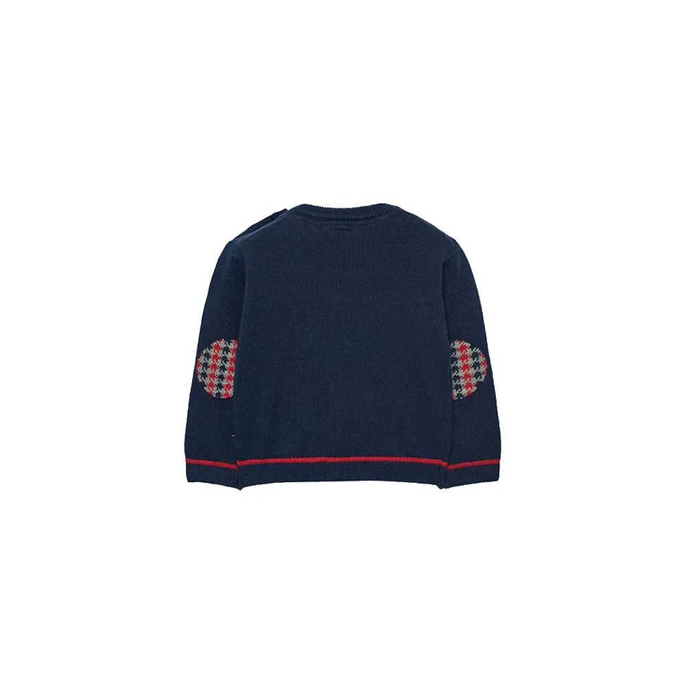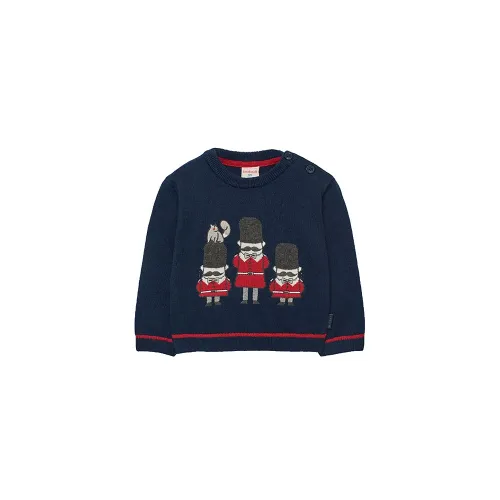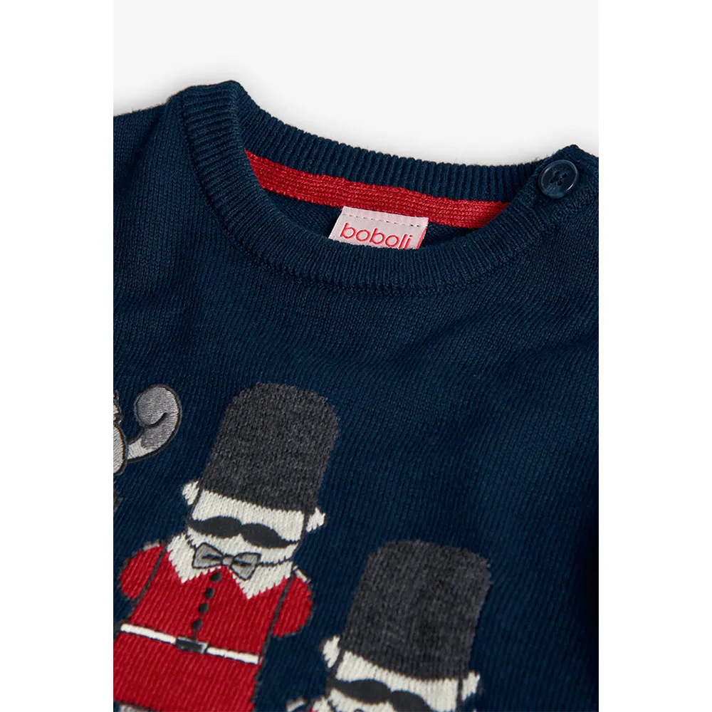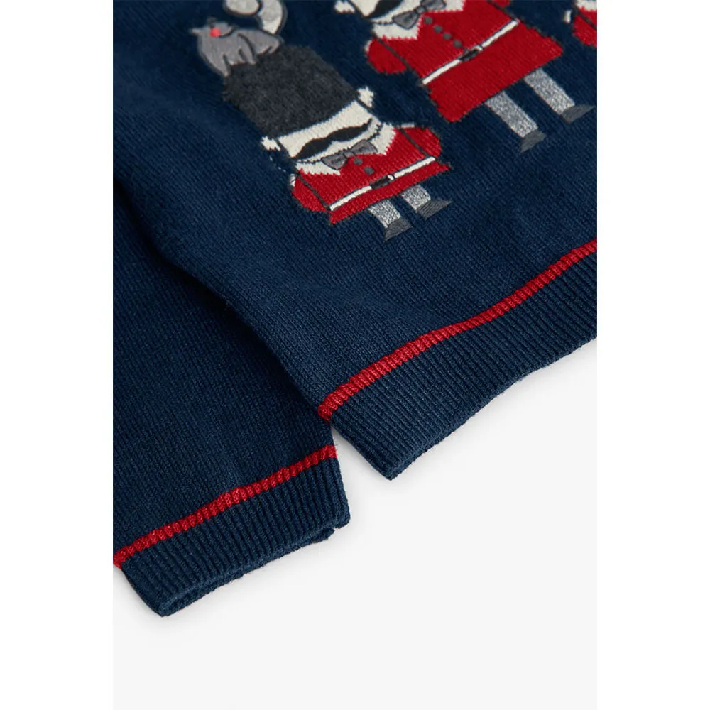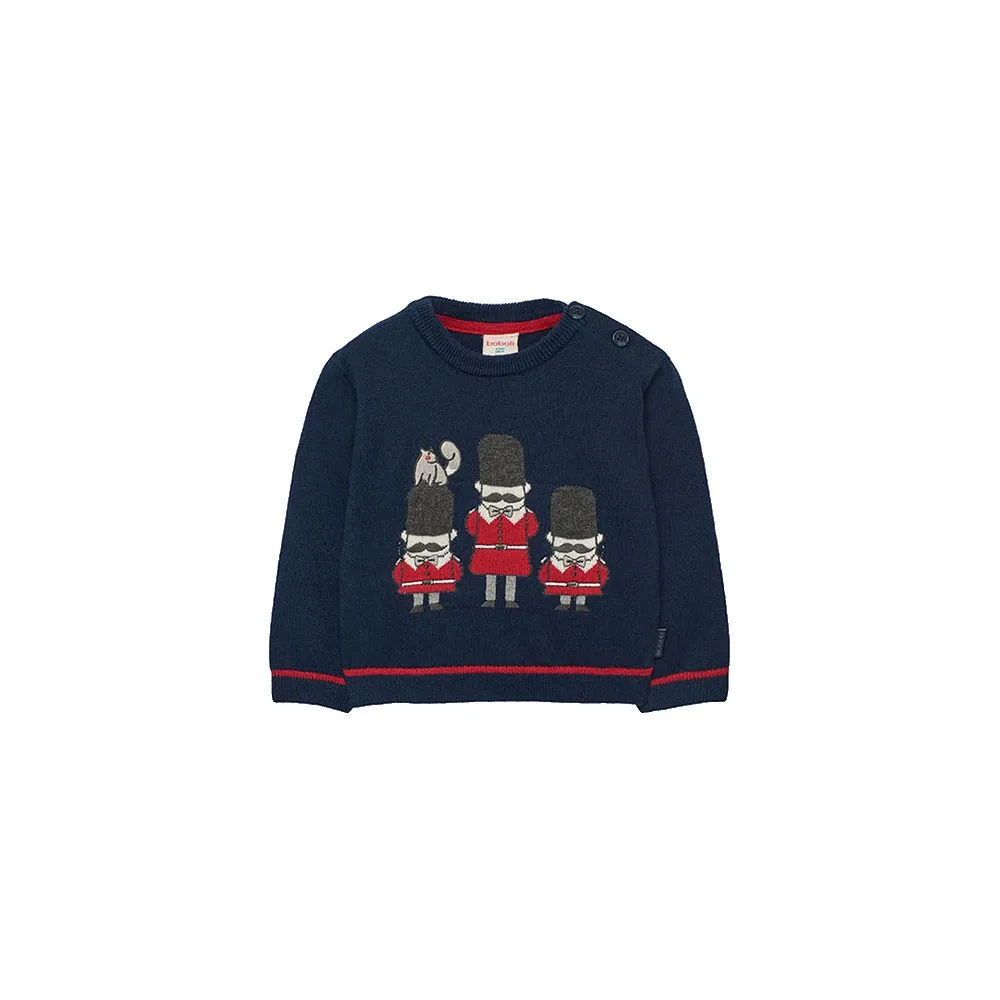 Marineblauer Strickpullover für Jungen mit einem charmanten Design aus Gardisten und einem Tier auf einem von ihnen, perfekt für die Herbst- und Wintersaison.