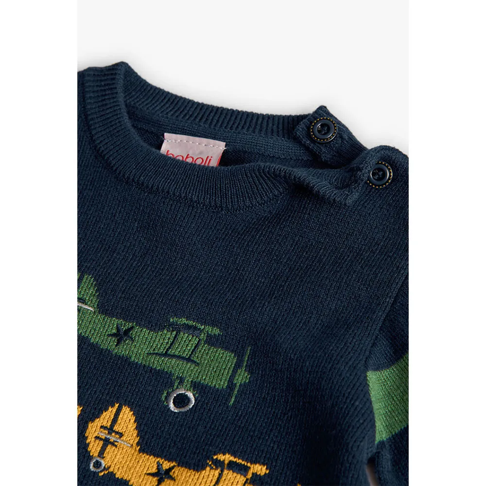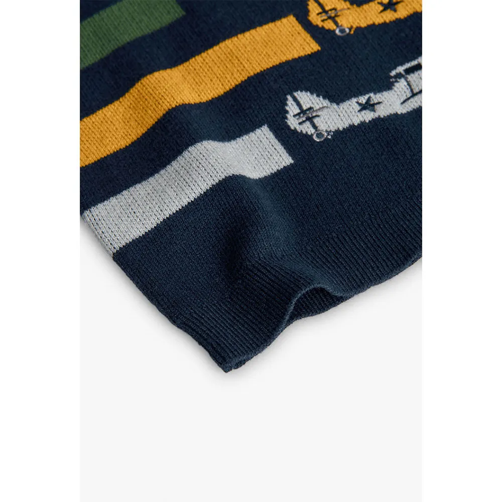 Marineblauer Strickpullover für Jungen mit Flugzeugmuster, geeignet für Herbst und Winter.
