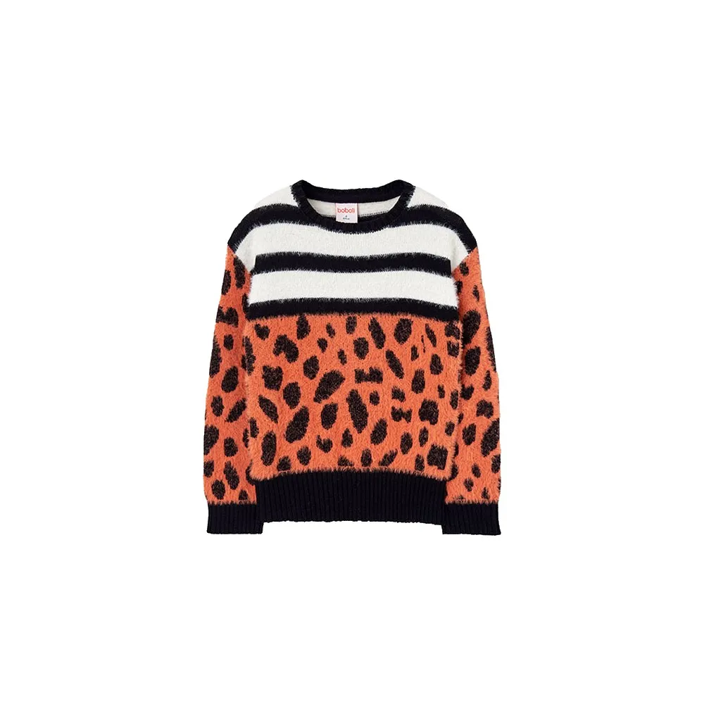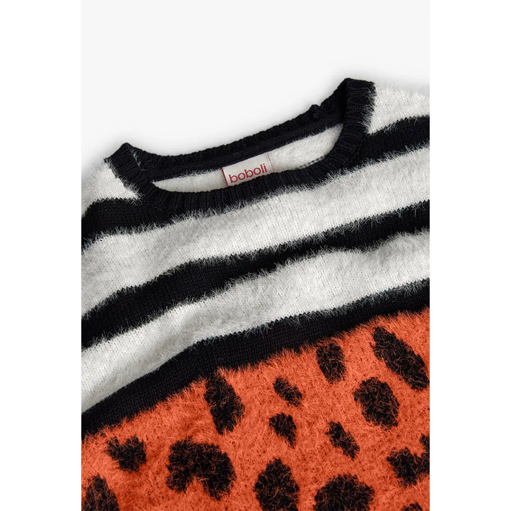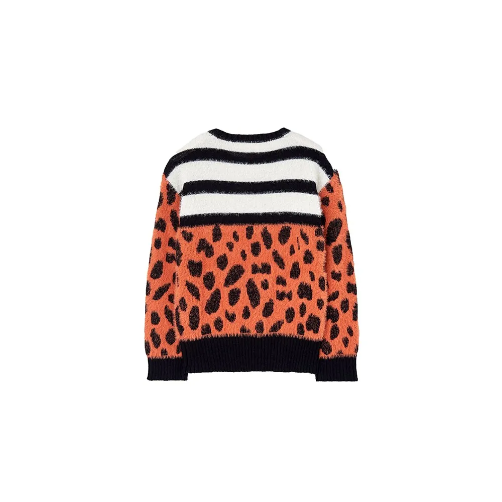 Gestrickter Mädchenpullover in einem leuchtenden Lachston mit einem auffälligen Tierdruckdesign, perfekt für die Herbst- und Wintermonate.