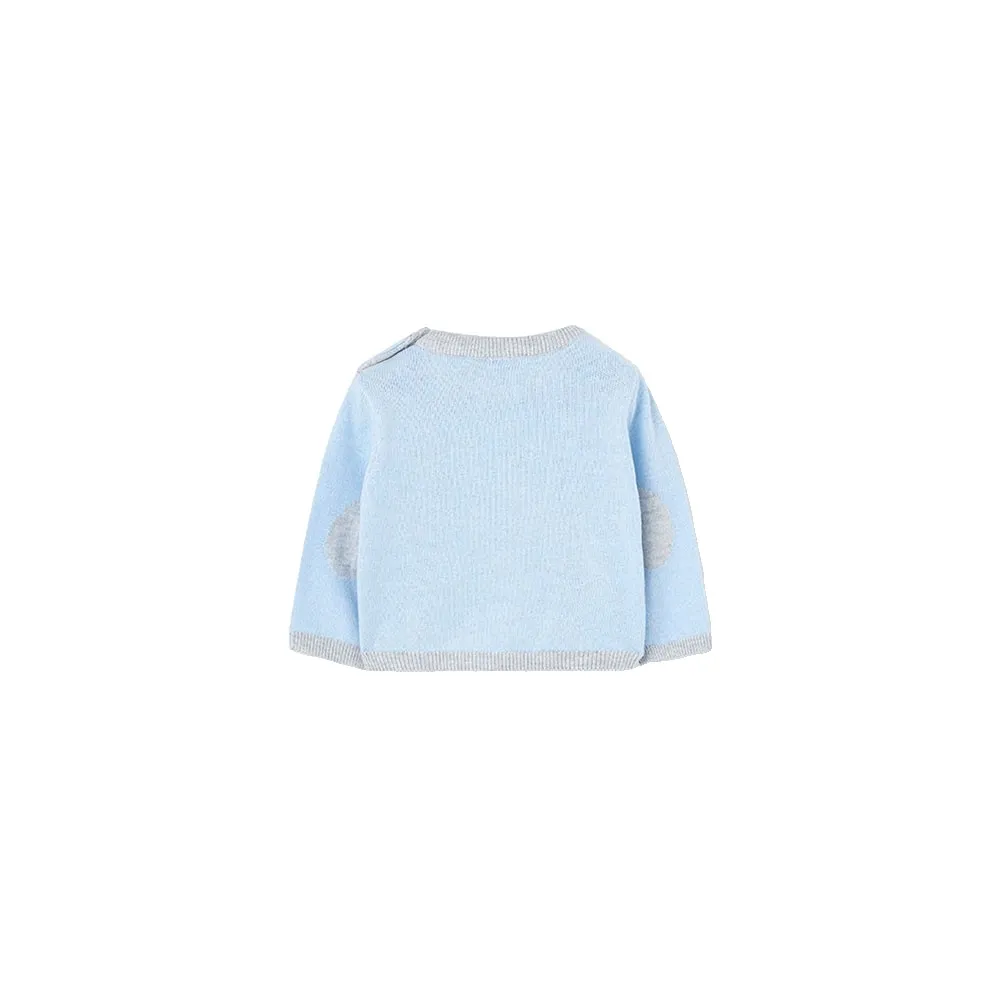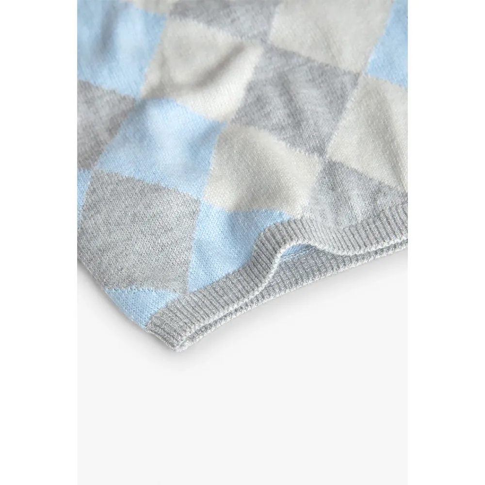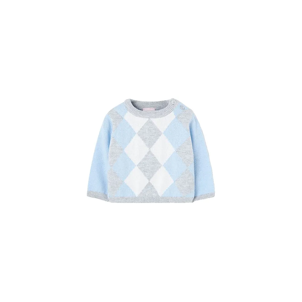 Gestrickter Pullover für Babyjungen in Hellblau mit Rautenmuster, ideal, um Ihr Kleines in den Herbst- und Wintermonaten warm zu halten.