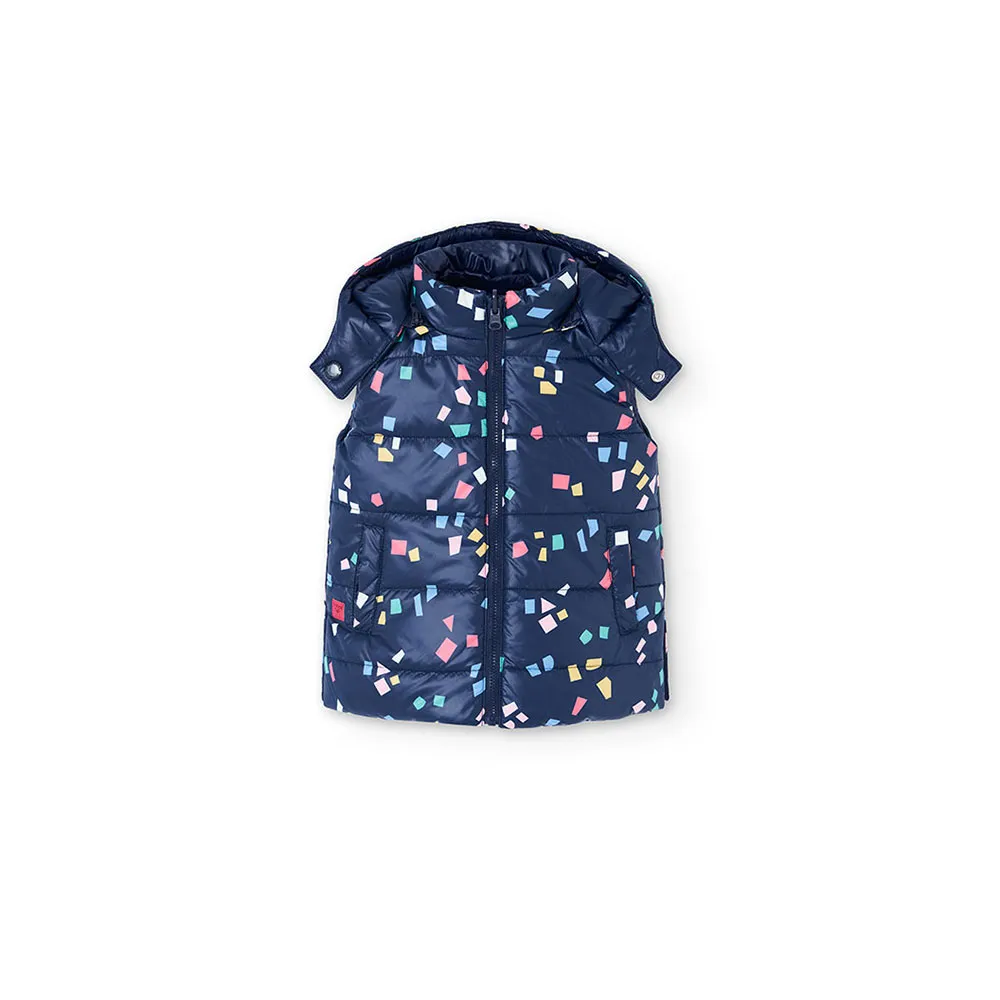 Wende-Gilet aus marineblauem Funktionsgewebe mit einem bunten geometrischen Design für Mädchen. Dieses charmante Kleidungsstück verleiht der Garderobe Ihres kleinen Lieblings einen Hauch von Freude.