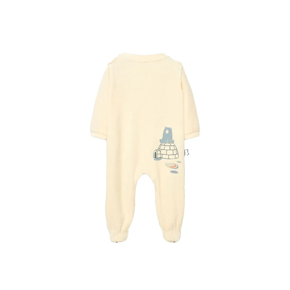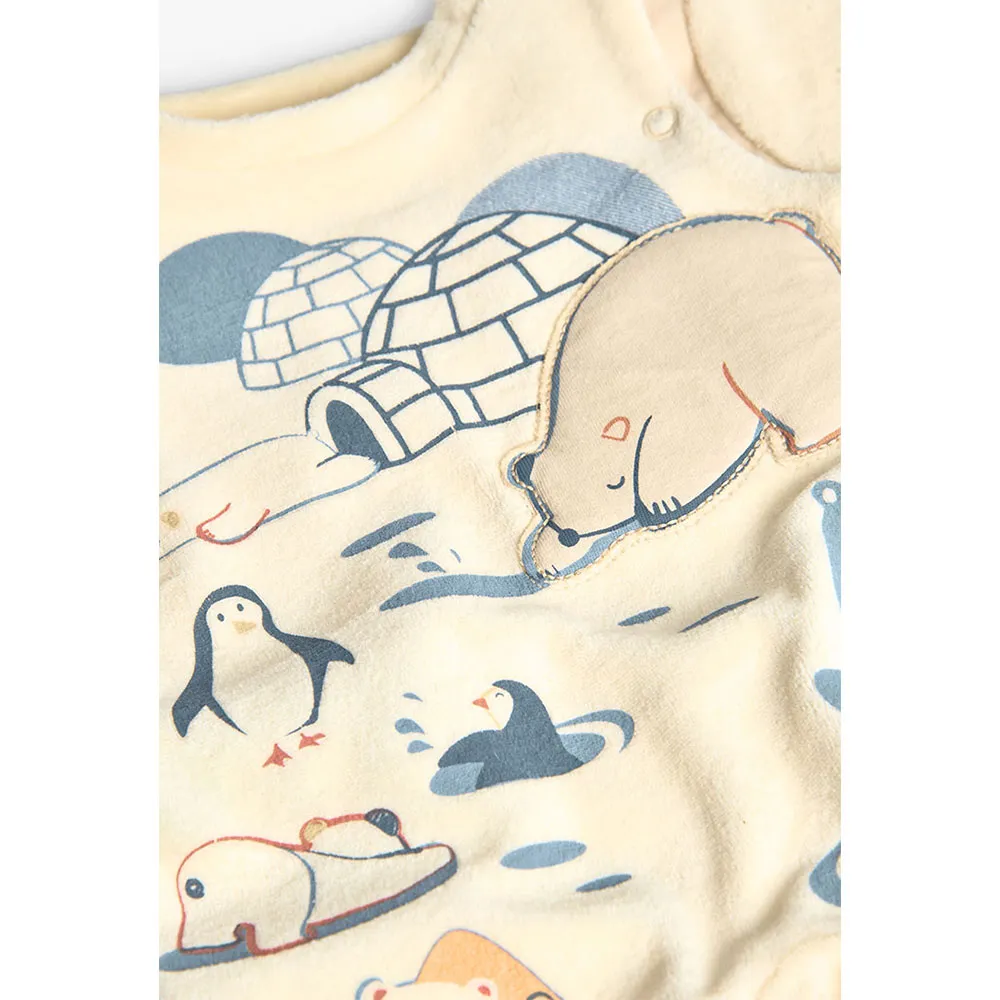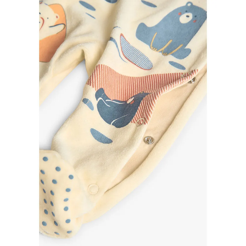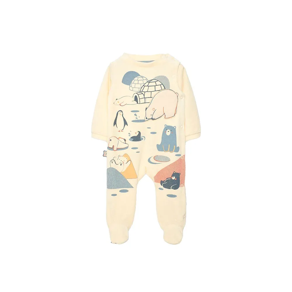 Baby-Schlafanzug aus rohem Samt mit Tiermuster, entworfen, um Babys in den kälteren Monaten bequem und warm zu halten.
