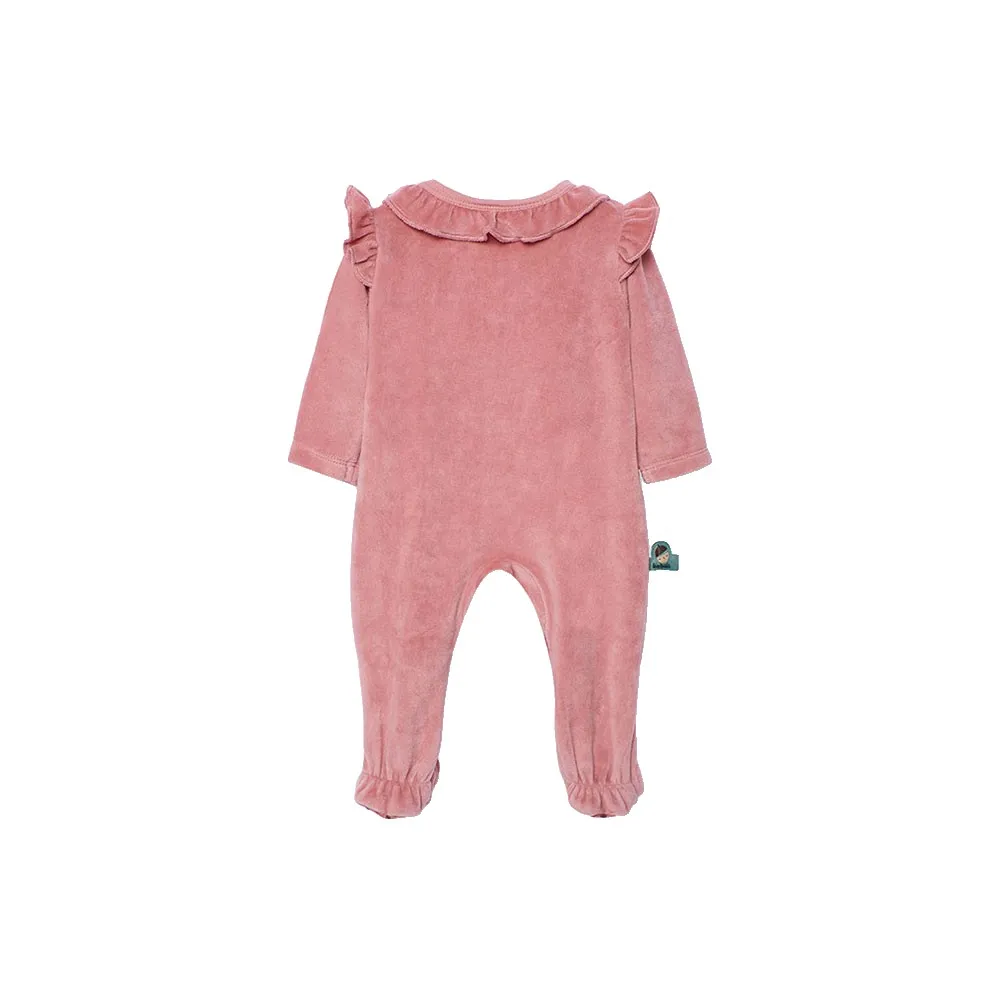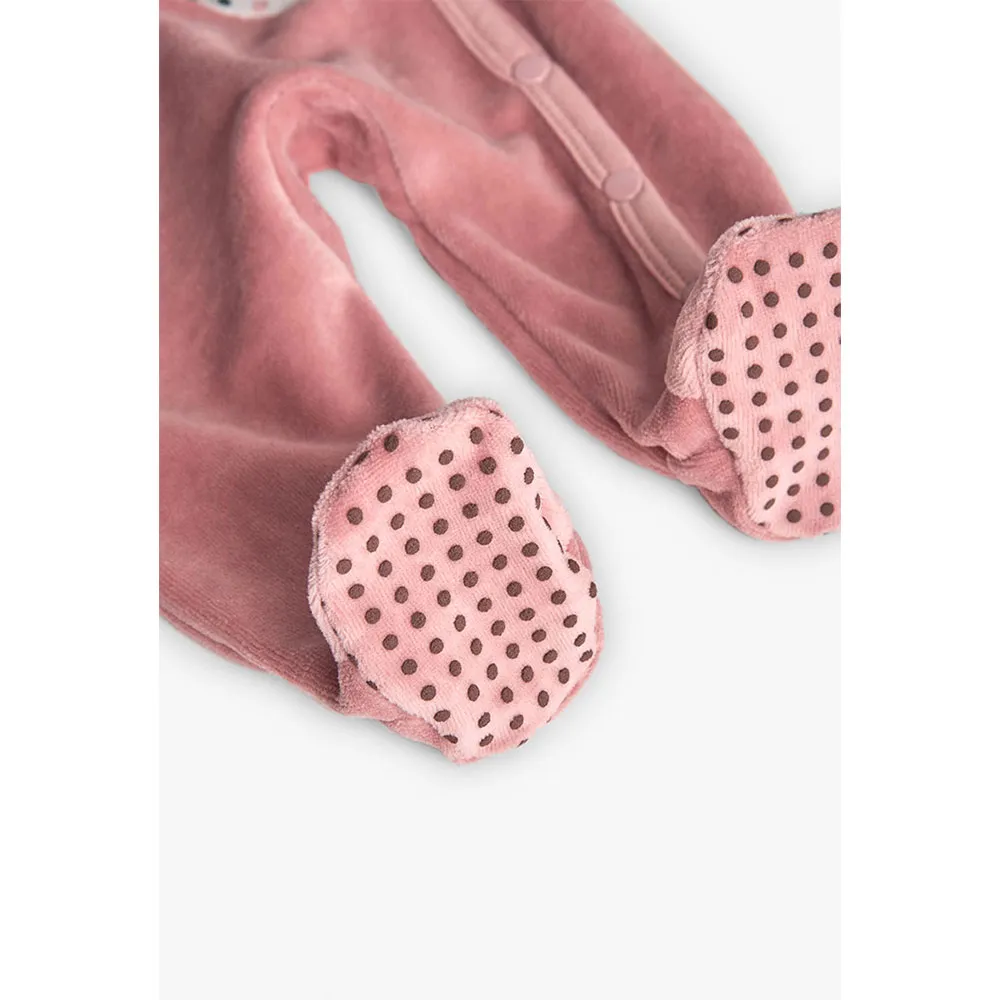 Samtiger Schlafanzug in zartem Rosa, verziert mit einem feinen Blumenmuster, perfekt, um Ihr Baby warm und bequem zu halten.