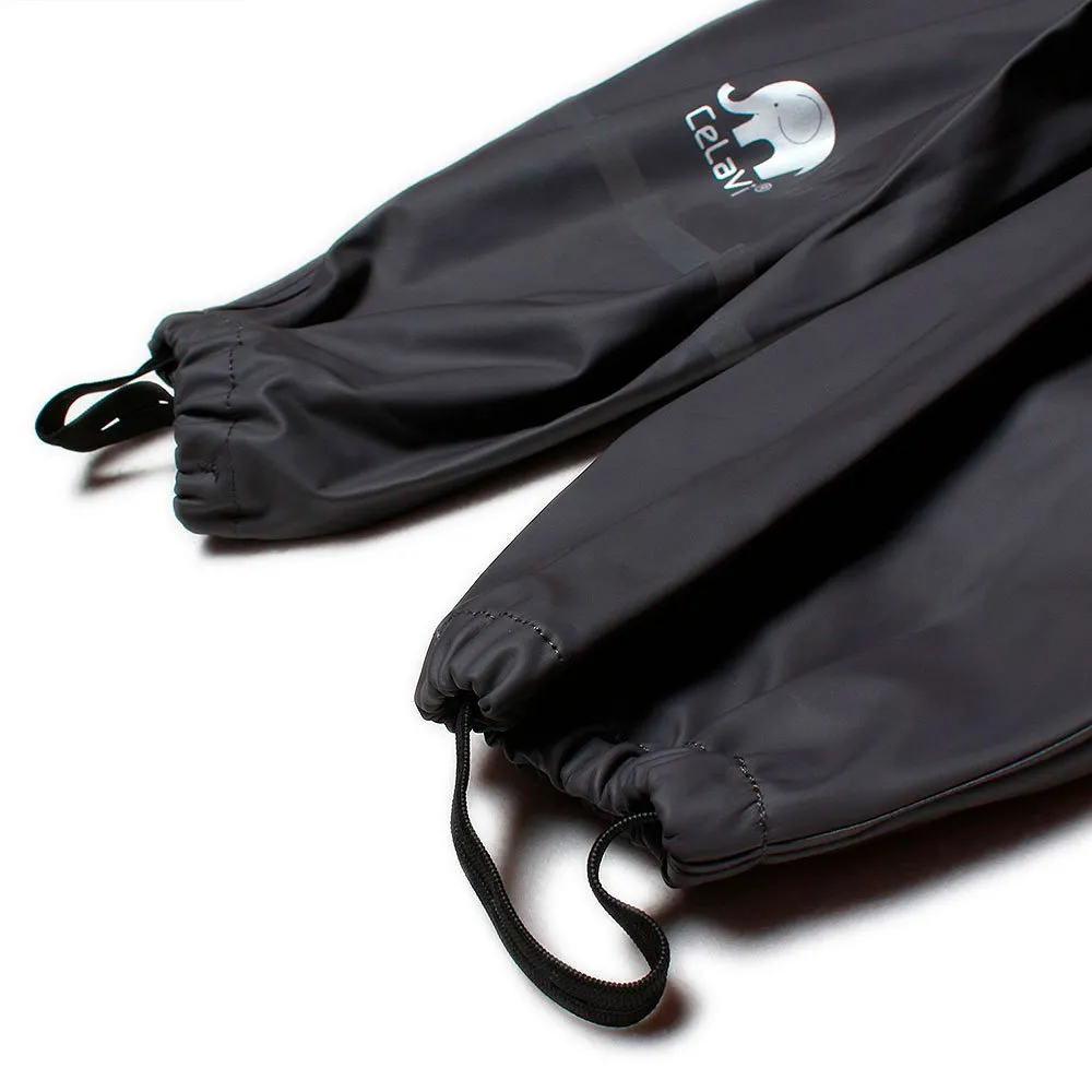 Das Set ist als Overall mit verstellbaren elastischen Trägern (Größe 70-100) mit einem Elefanten und dem celavi-Logo auf der Brust und am Bein erhältlich.