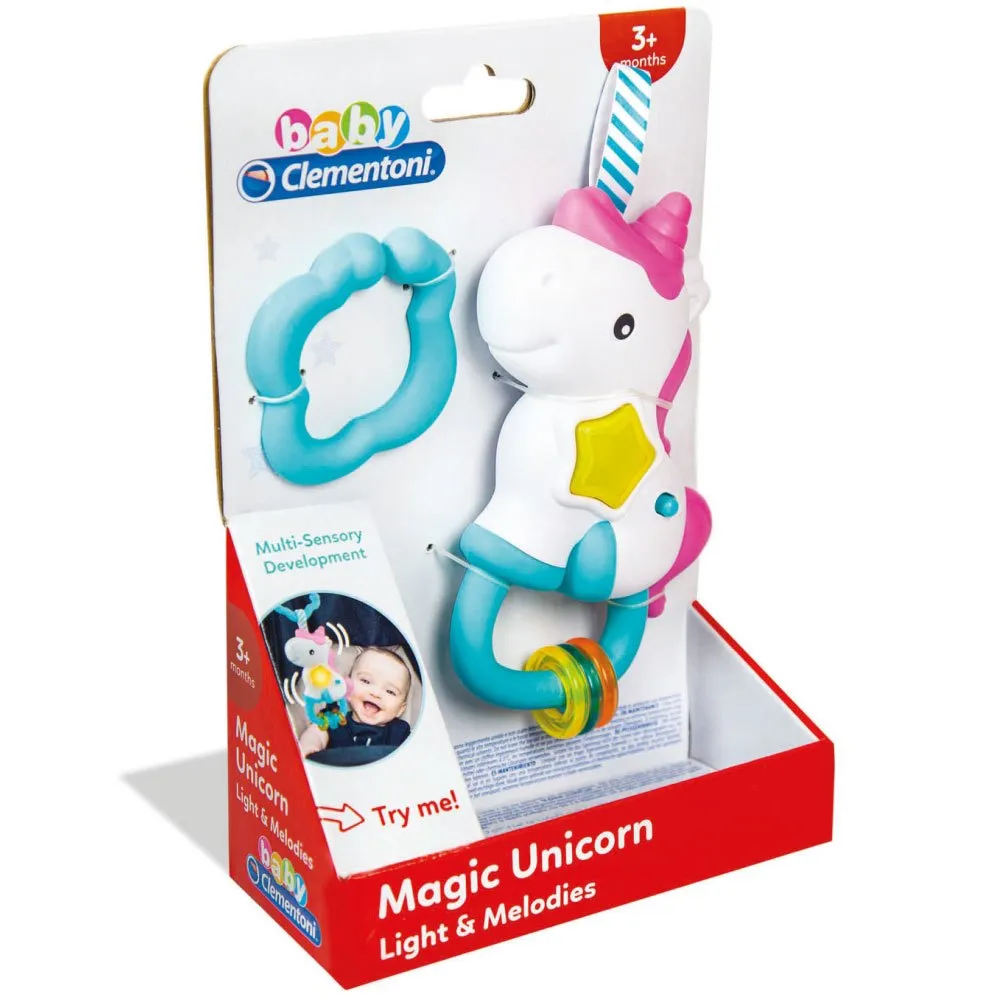 Das CLEMENTONI Einhorn-Musical ist fachmännisch gefertigt, um mehrere Sinne anzusprechen und ein gesundes kognitives und körperliches Wachstum zu fördern. Seine leuchtenden Farben und weichen, strukturierten Oberflächen stimulieren die visuelle und taktile Entwicklung, während die sanften, melodischen Klänge die auditiven Sinne fesseln und die Kleinen beruhigen. Die integrierte Rassel-Funktion fügt eine weitere Ebene der sensorischen Stimulation hinzu und fördert das Greifen, Schütteln und die Hand-Augen-Koordination. Beobachte, wie das Gesicht deines Babys vor Freude aufleuchtet, wenn es die magischen Klänge und Texturen seines neuen Einhorn-Freundes entdeckt.