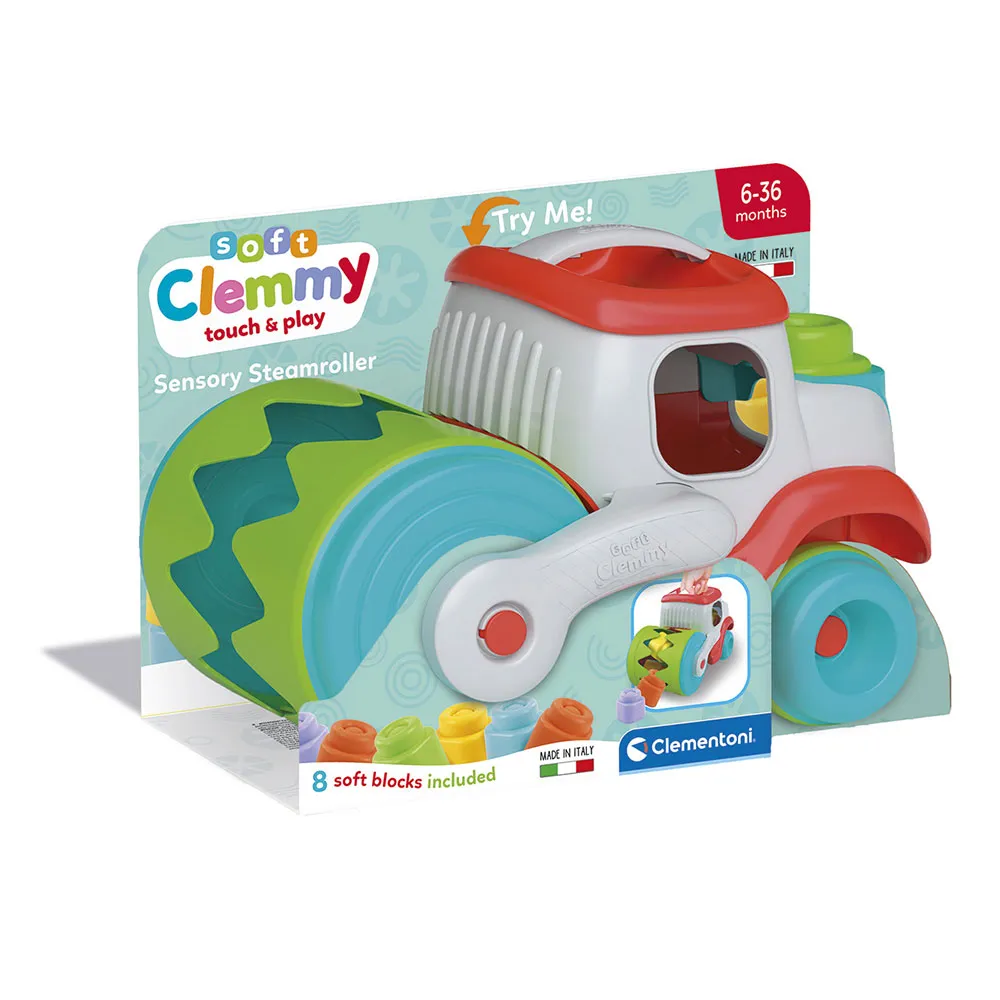 Ein freundliches sensorisches Fahrzeug mit einer "Bausteine-fressenden" Walze und dem unverwechselbaren Clemmy-Design.
