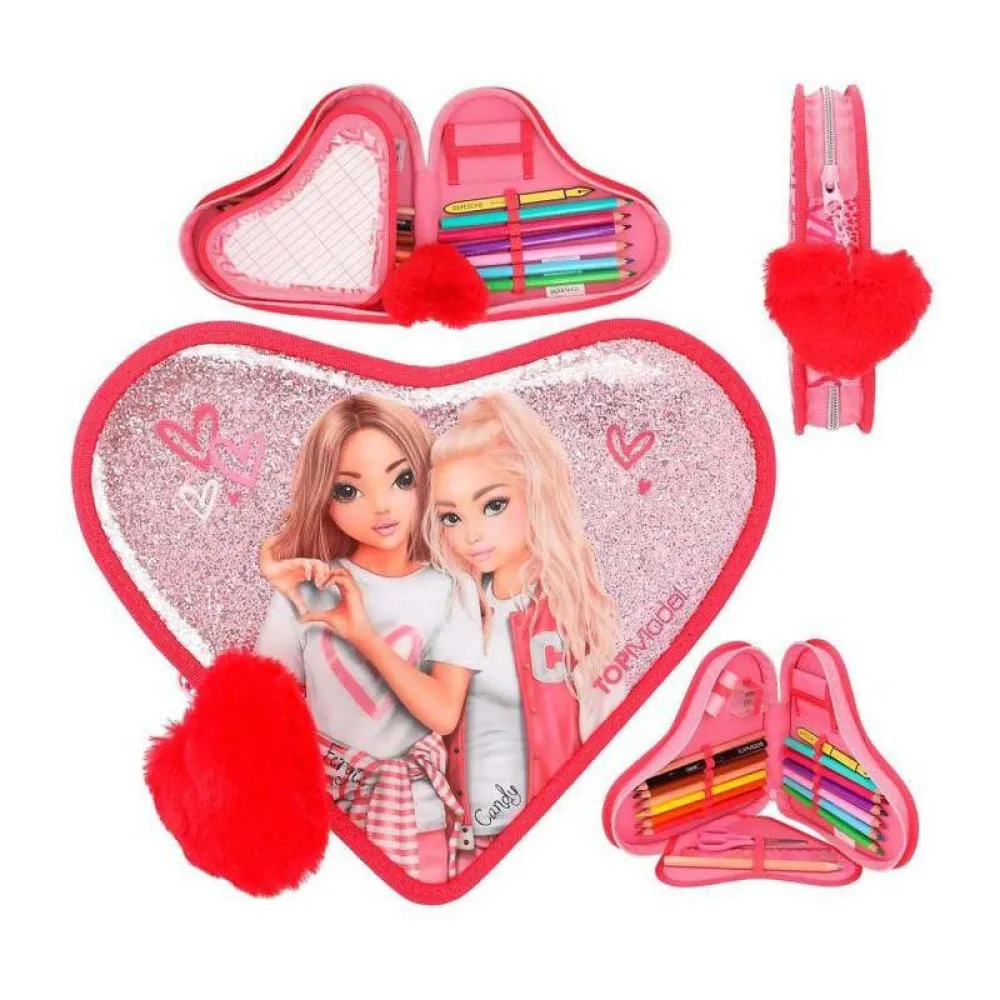 Einfach bezaubernd: Das TOPModel Federmäppchen in Herzform hat eine super glitzernde Vorderseite mit tollem Model-Motiv und ein hübsches Herz allover an der Seite und Rückseite. Kuscheliges Plus: der Plüsch-Herz-Anhänger am Reißverschluss. Das Federmäppchen ist komplett gefüllt mit 12 dicken Buntstiften, 2 Bleistiften, Radiergummi, Spitzer, Lineal, Schere und einem Stundenplan. Material: 100 Prozent PES; PVC auf der Vorderseite.
